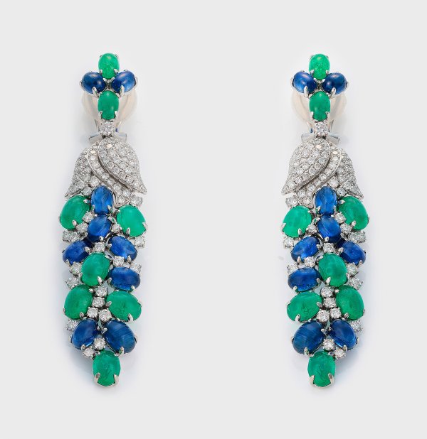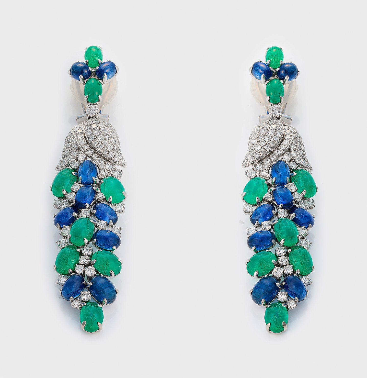 Pair of earrings set with emeralds approx. 11,20 ct., sapphires approx. 12,20 ct. and diamonds approx. 3,30 ct. (G-H/vs1), in 18 k white gold.