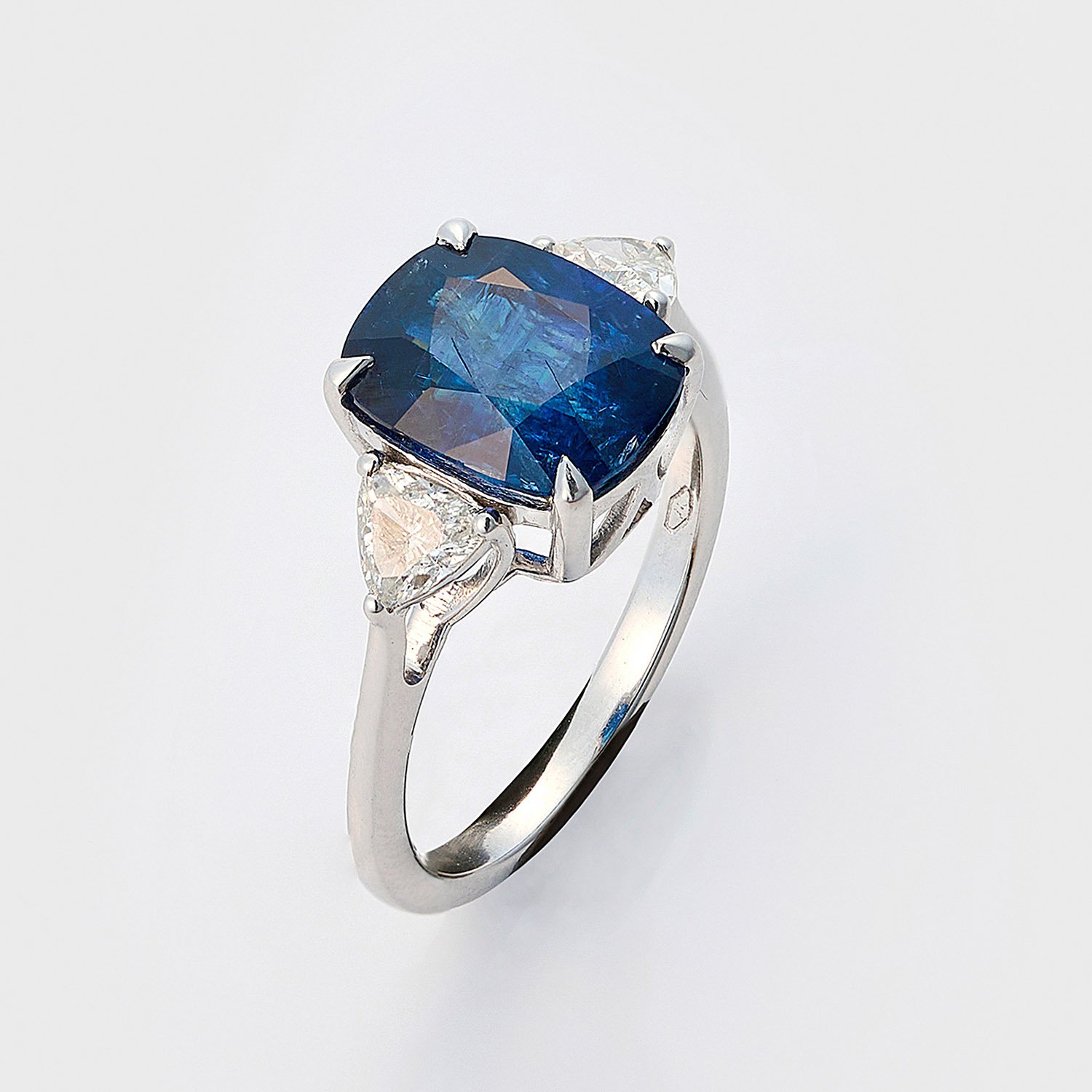 Weißgold, gest. 750. Zentral besetzt mit einem unbehandeltem Intense Blue-Saphir von ca. 4,68 ct., flankiert von Diamant-Trillanten von zus. ca. 0,80 ct.; Gew. ca. 4,73 g.