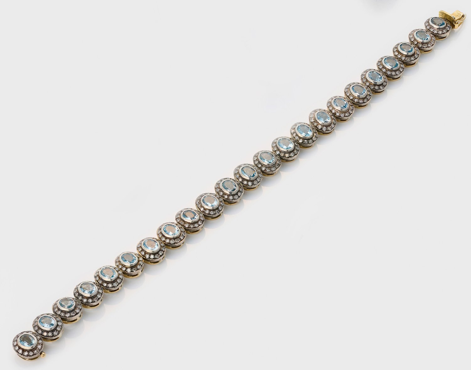 Bracelet set with diamonds approx. 3,95 ct. and sapphire sky blue aquamarines approx. 19,50 ct., in 14 k gold and silver.