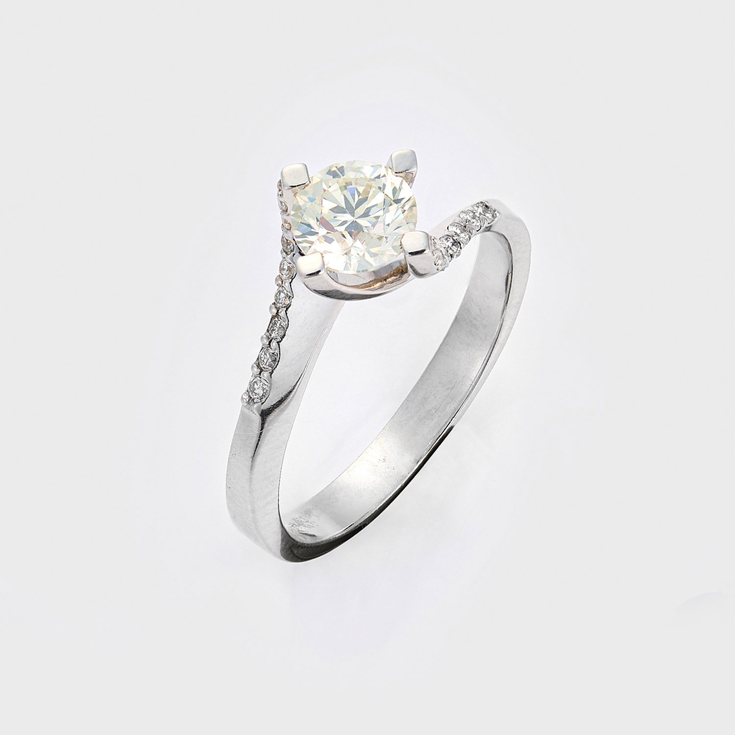 Ring set with a brilliant solitaire approx. 0,94 ct. (H/vs1) and small diamonds approx. 0,12 ct. (D-F/vs2), in 14 k white gold. Certificate included.