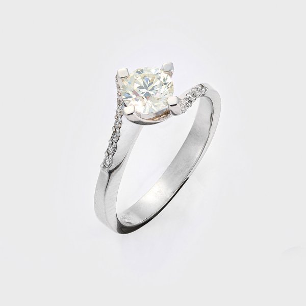Weißgold, gest. 585. Zentral besetzt mit einem Brillant von ca. 0,94 ct. (H/vs1), flankiert von Brillanten von ca. 0,12 ct. (D-F/vs2). Gew. ca. 3,04 g.