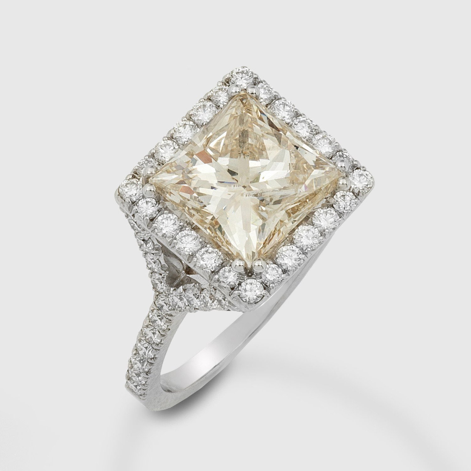 Weißgold, gest. 750. Zentral besetzt mit einem Diamanten im Princesscut von ca. 4,42 ct. (J/si2), entouriert von kleinen Brillanten von zus. ca. 1,20 ct. (top wesselton(F-G)/vvs). Gew. ca. 6,30 g.