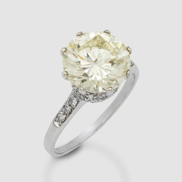Ring set with a diamond solitaire approx. 5,45 ct. (very light yellow/si1) and small diamonds approx. 0,22 ct., in 18 k white gold. Certificate included.