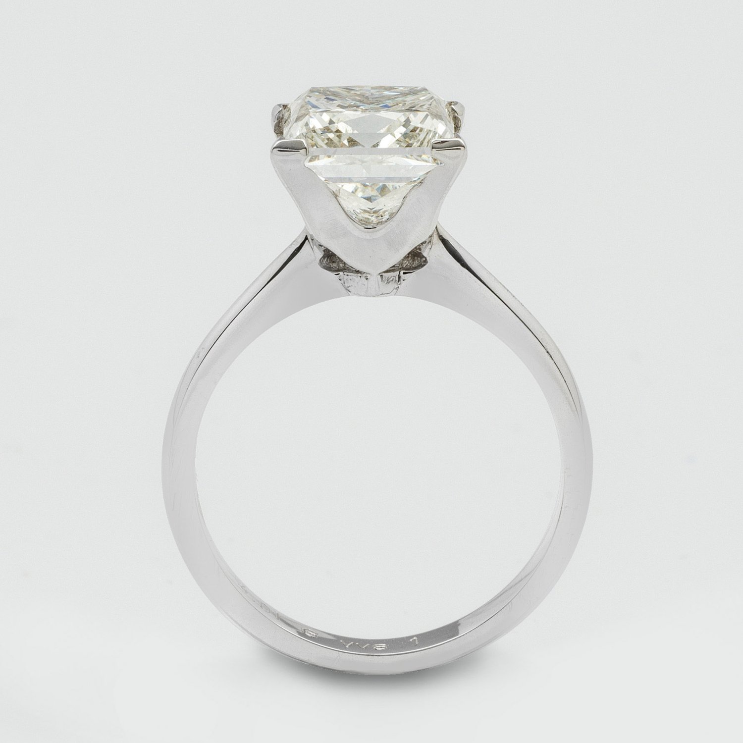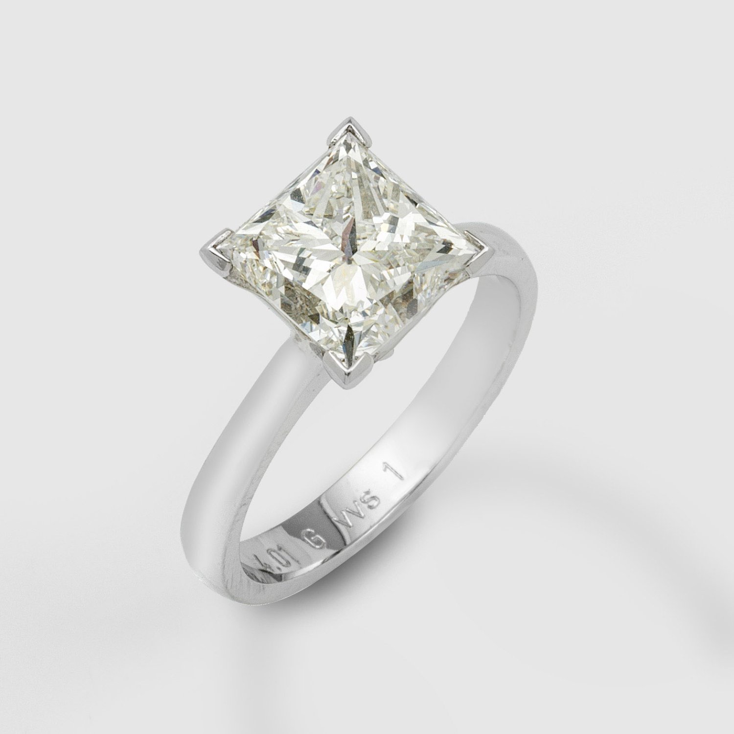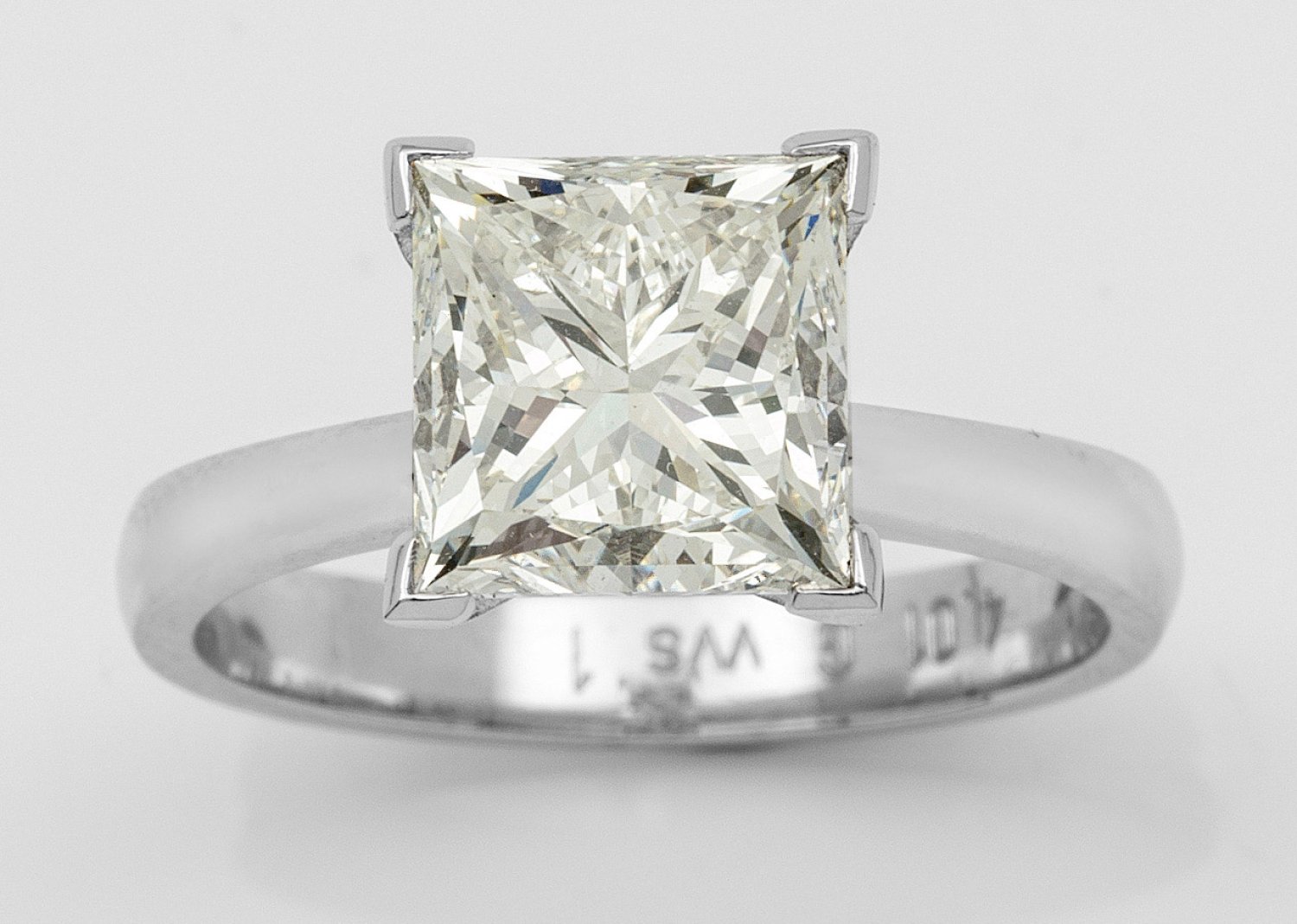 Weißgold, gest. 750. Zentral besetzt mit einem Diamanten von ca. 4,01 ct. (G/vvs1) im Princesscut. Gew. ca. 5,44 g.