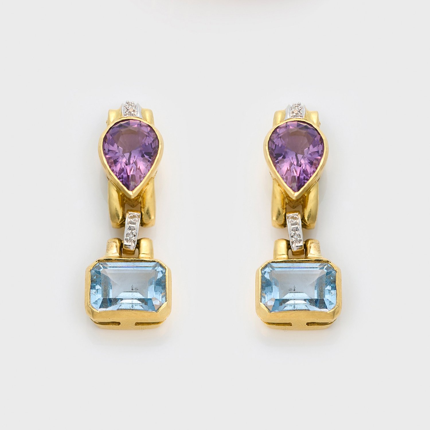 Pair of earrings set with amethysts and topazes, in 18 k gold.