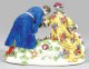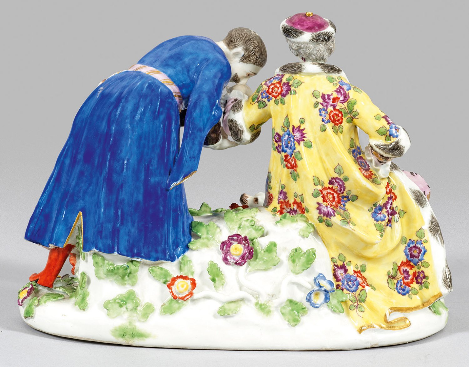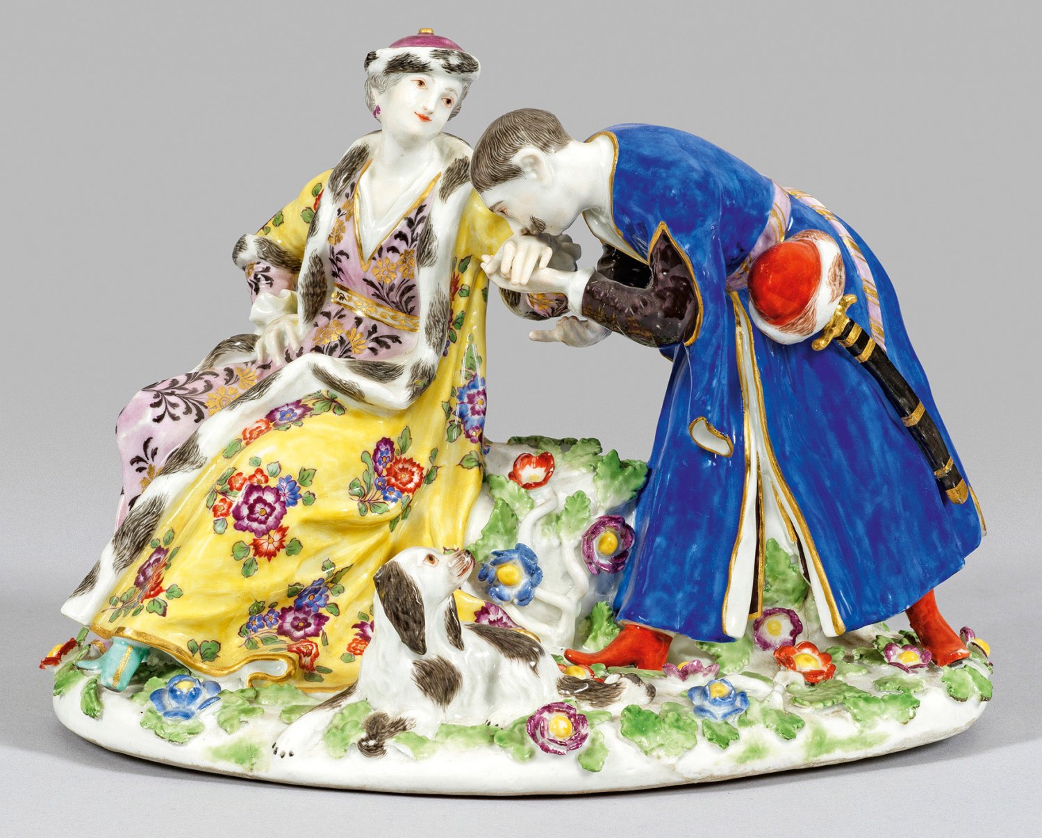 Auf einem mit plastischen Blüten und Blättern belegtem Sockel szenische Darstellung eines galanten Paares. Auf einer Steinbank sitzende Dame in polnischer Tracht aus gelbem, mit Kakiemonblüten gemusterten, pelzgefüttertem, langem Mantel über purpurfarbenem, von Goldblüten und Rankenwerk gemustertem Gewand. Das Haar von einer pelzverbrämten Mütze bedeckt. Seitlich zugewandter, sich ehrerbietig vorbeugender, polnischer Edelmann in blauem Gewand mit gegürtetem Schwert, ihr einen Handkuss gebend. Zu ihren Füßen ruhender, weiß-schwarz gefleckter Wachtelhund. Polychrome Malerei mit Gold. Entw. Johann Joachim Kaendler, um 1743. Herstellungsbed. Brandrisse. Minim. rest.; H. 17 cm. L. 23 cm.