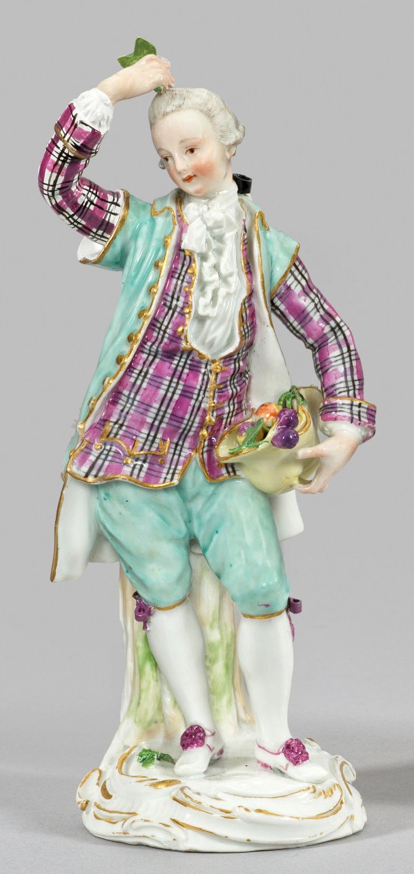 Auf rocaillereliefiertem Sockel, angelehnt an einen Baumstumpf, stehender Gärtner mit Früchten befülltem Hut in der linken Hand. Polychrome Malerei mit Goldkonturierung. Minim. rest.; Schwertermarke. H. 18 cm.