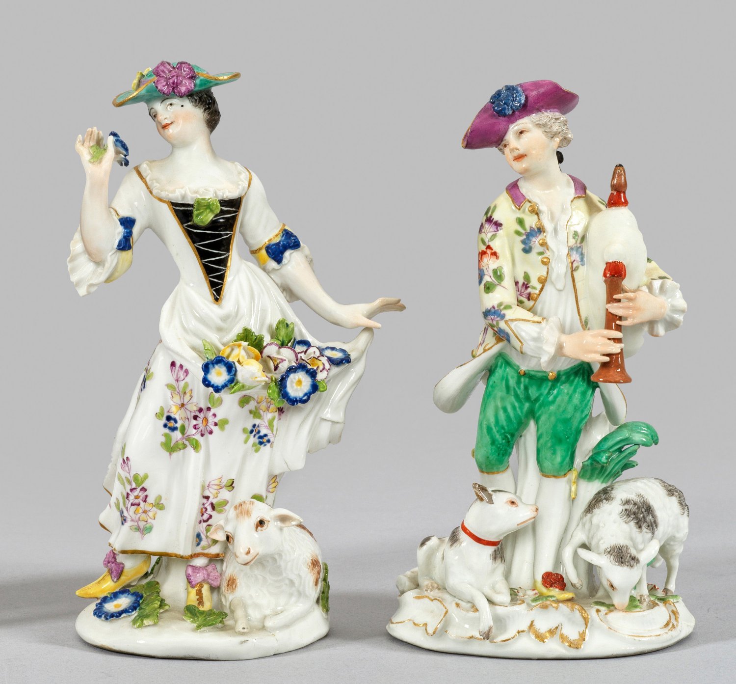 Auf rocaillereliefiertem bzw. mit plastischen Blumen besetztem Sockel stehender junger Schäfer mit Dudelsack, grasendem Schaf und liegendem Hund bzw. Schäferin mit Blumen in der Schürze und liegendem Schaf. Polychrome Malerei mit Goldstaffage. Entw. Johann Joachim Kaendler. Modell-Nr. 61003. Rest.; Schwertermarke. H. 15 cm - 15,5 cm.