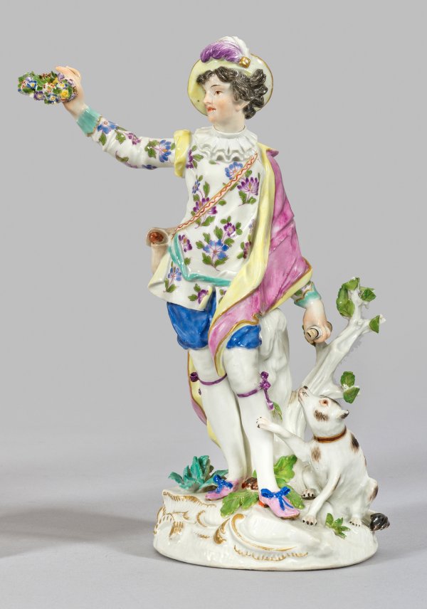 Auf rocaillereliefiertem Rundsockel an einen Baumstumpf gelehnter Schäfer, eine mit Kakiemonblüten gemusterte Weste tragend, mit der erhobenen rechten Hand einen Blütenkranz emporstreckend. Polychrome Malerei mit dezenter Goldstaffage. Entw. Johann Joachim Kaendler, 1750. Unw. rest./best.; Schwertermarke. H. 26,5 cm.