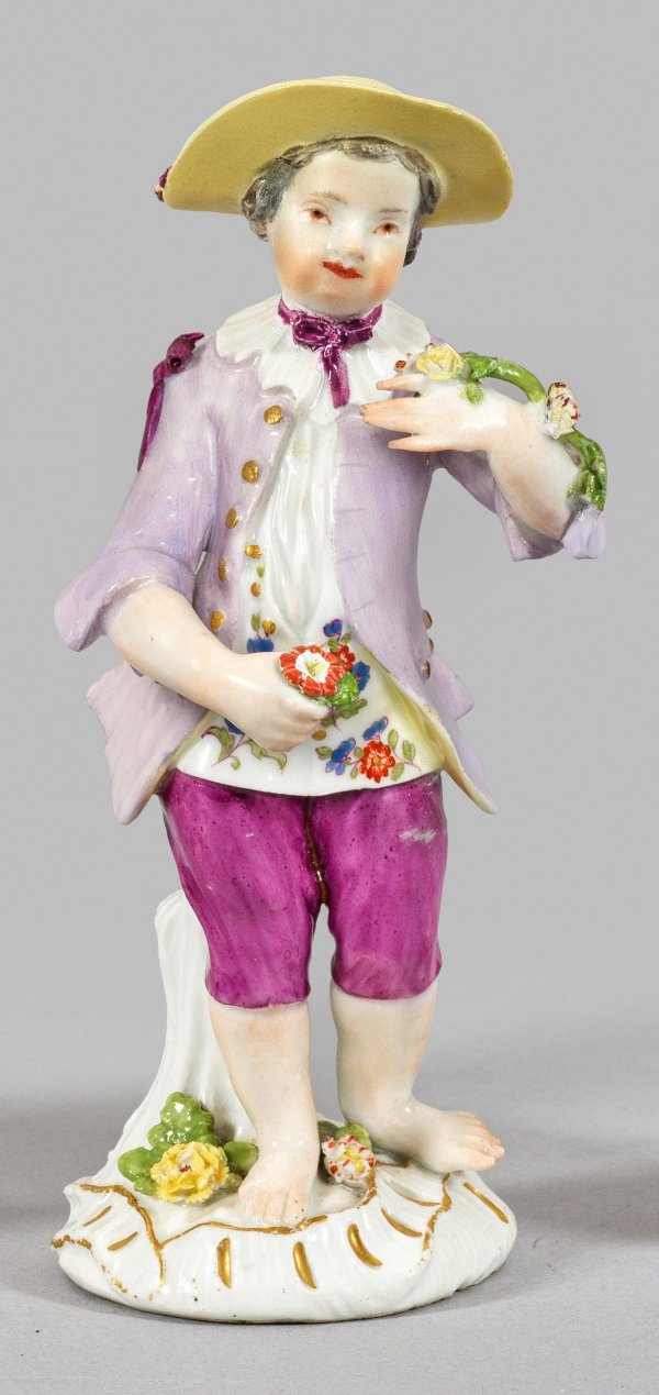 Auf reliefiertem Rocaillesockel stehender Gärtnerknabe, in der linken Hand eine Blumengirlande. Polychrome Malerei mit Goldkonturierung. Entw. Johann Joachim Kaendler. Rest.; Schwertermarke. H. 14 cm.
