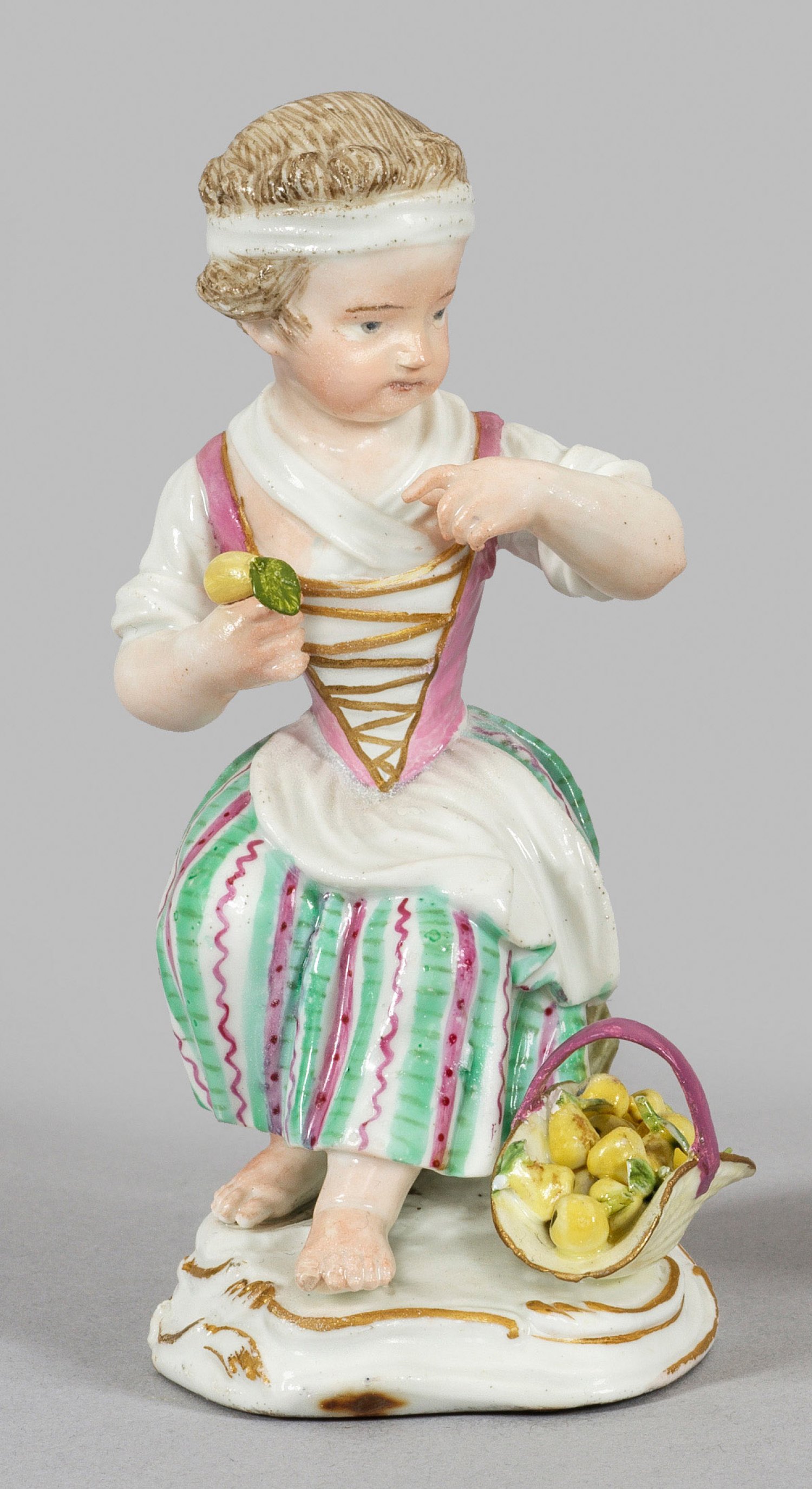 Auf rocaillereliefiertem Sockel stehendes Mädchen in sommerlicher Kleidung, in der rechten Hand eine Zitrone haltend, zu ihren Füßen ein Zitronenkorb. Polychrome Malerei mit Goldstaffage. Entw. Johann Joachim Kaendler. Minim. best./produktionsbed. Brandfleck. Rest.; Schwertermarke. H. 14 cm.