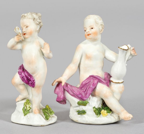 Auf einem mit plastischen Blumen und Blattwerk besetzten Felssockel sitzender bzw. stehender männlicher und weiblicher Putto, jeweils mit violettfarbenem Lendenschurz bekleidet. In den Händen eine Karaffe bzw. ein Notenblatt haltend. Polychrome Malerei mit Goldstaffage. Best./rest.; Schwertermarke. H. 9 cm - 9,5 cm.