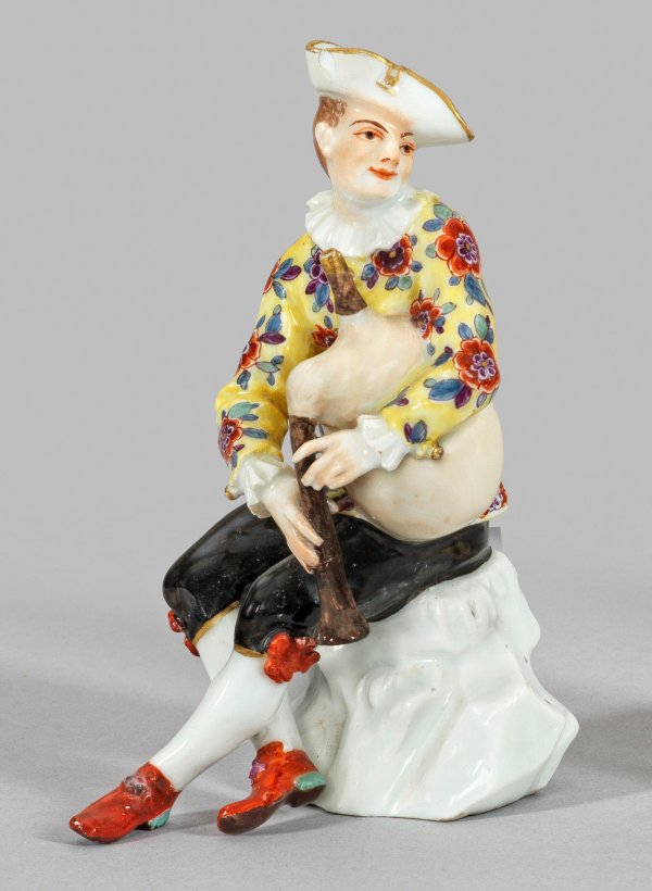 Auf felsiger Anhöhe sitzender, junger Harlekin mit Dudelsack. Polychrome Malerei mit Goldkonturierung. Entw. Johann Joachim Kaendler. Minim. rest.; H. 13 cm.