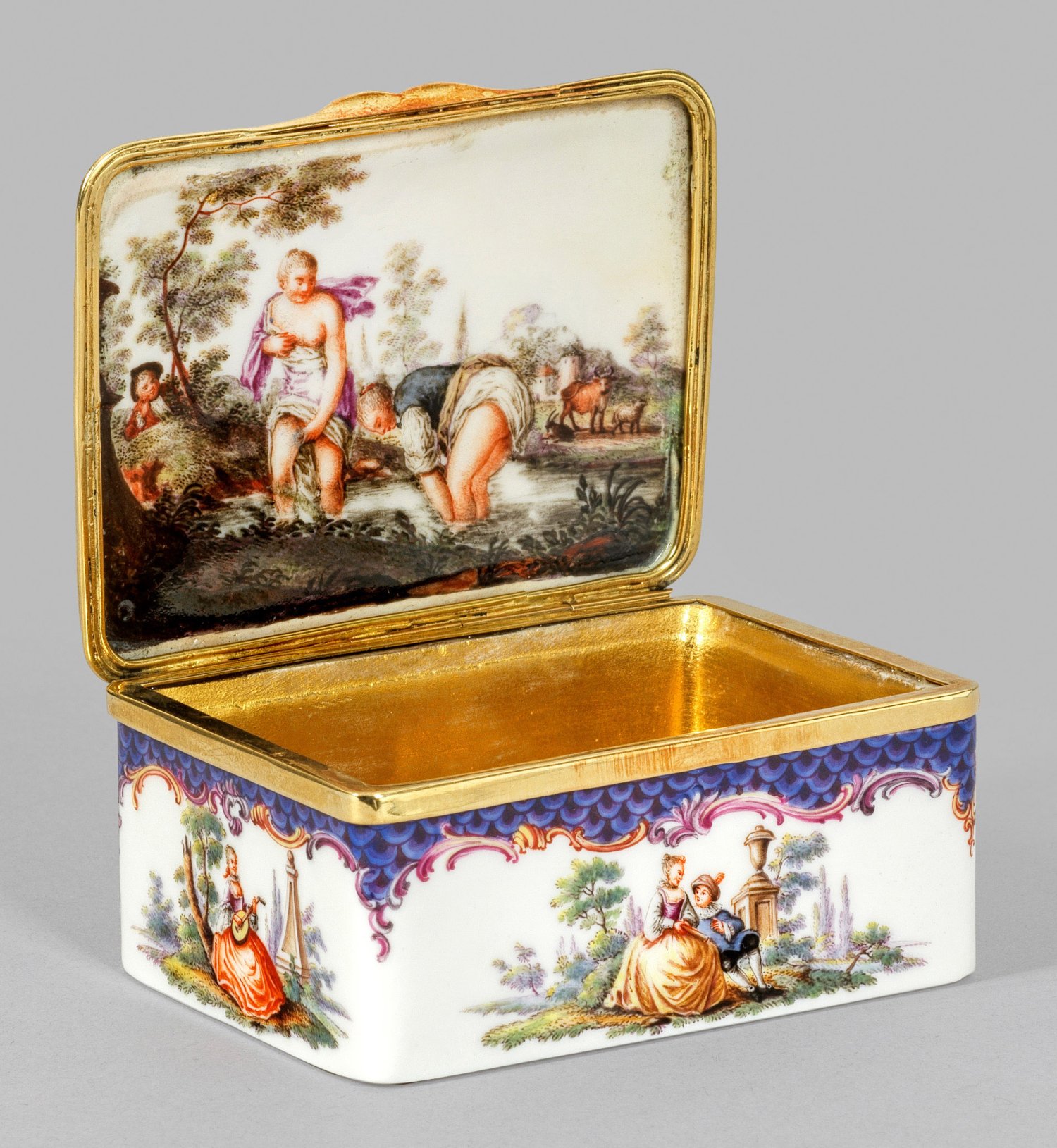 Rechteckig abgerundeter Korpus mit gewölbtem Scharnierdeckel. Im Spiegel und oberhalb des Unterteils blauviolettes, von Rocaillen gesäumtes Schuppenmuster. Auf dem Deckel, allseits der Wandung und rücks. verschiedene galante Figurenpaare und Einzelpersonen nach Watteau in architektur- und baumbestandener Parklandschaft. Im Spiegel des Innendeckels zwei Damen beim Bade, beobachtet von einem Jüngling. Der Innenboden gänzlich vergoldet. Feine polychrome Malerei mit Goldstaffage. Goldmontage. H. 3,5 cm. 7,5 cm x 6 cm.