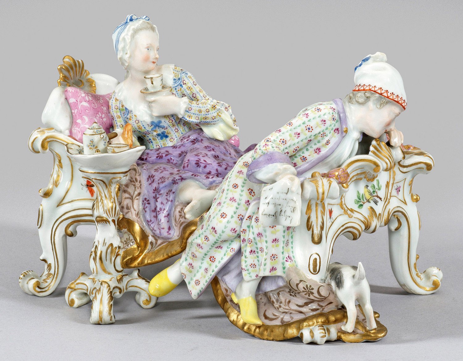 In einem prunkvollen, rocaillereliefiertem Rokoko-Bett sitzende Dame mit einer Tasse Kakao und Gebäck, an dessen Fußende der über die Lehne blickende Ehegatte. Am Bettende, hinter einem Kissen versteckter Amor mit Pfeil und Köcher. Polychrome Malerei mit Goldstaffage. Entw. Johann Joachim Kaendler, 1770/71. Unw. Rest.; Schwertermarke. 20 cm x 12,5 cm x 13 cm.