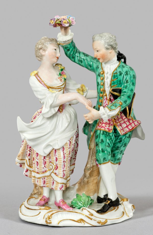 Auf ovalem, mit plastischem Blattwerk belegtem Rocaillesockel tanzend ein junges Liebespaar mit Blumenkranz, in feiner Kleidung. Polychrome Malerei mit Goldkonturierung. Entw. Johann Joachim Kaendler, 1770. Eingeritzte, alte Modell-Nr. "C 75". Schwertermarke. Minim. best./rest.; H. 16 cm.