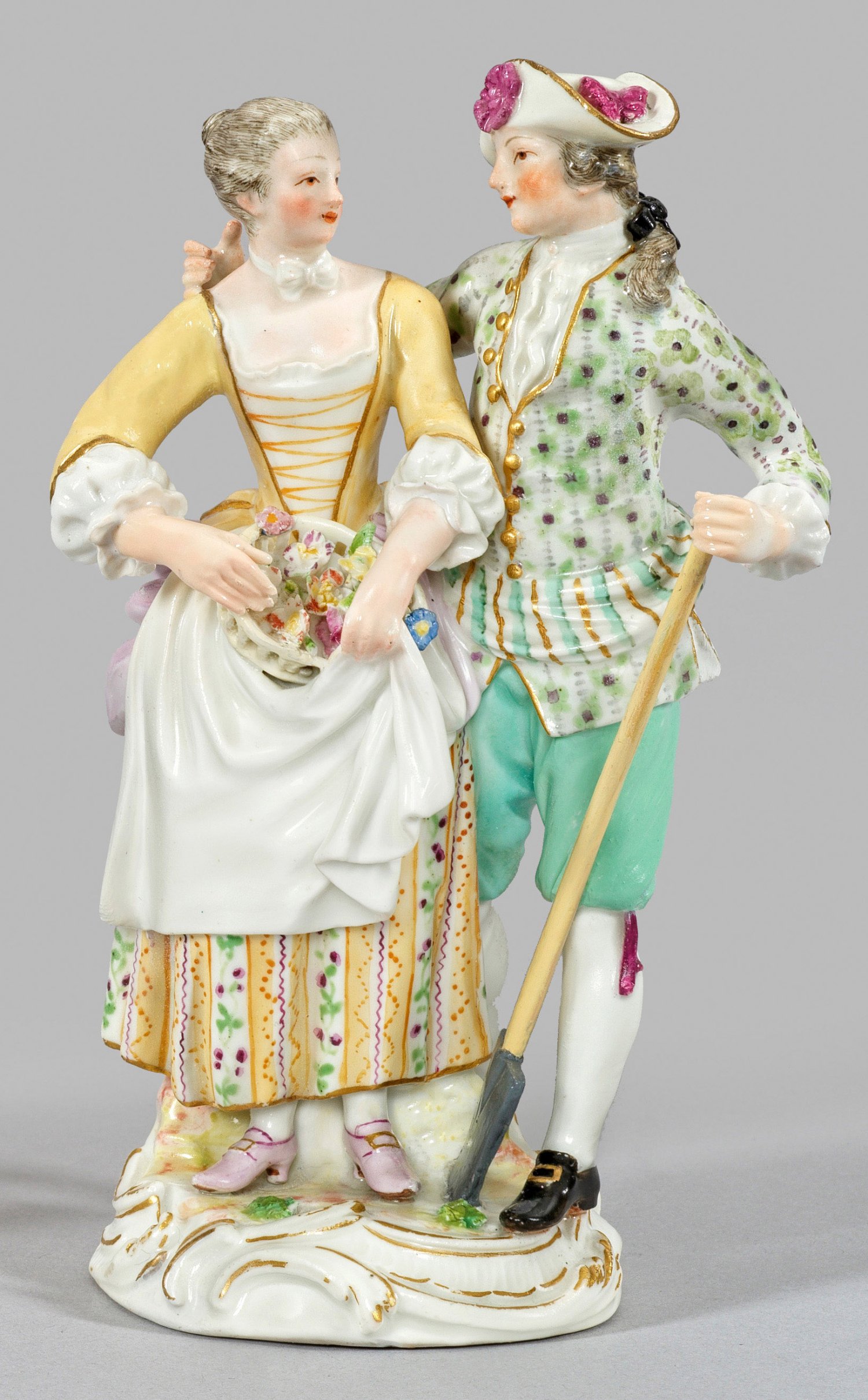 Auf rundem, mit plastischem Blattwerk belegtem Rocaillesockel stehendes junges Gärtner-Liebespaar mit Blumenkorb und Spaten. Polychrome Malerei mit Goldkonturierung. Entw. Johann Joachim Kaendler, 1754. Eingeritzte, alte Modell-Nr. 37. Schwertermarke. Best./rest.; H. 16 cm.