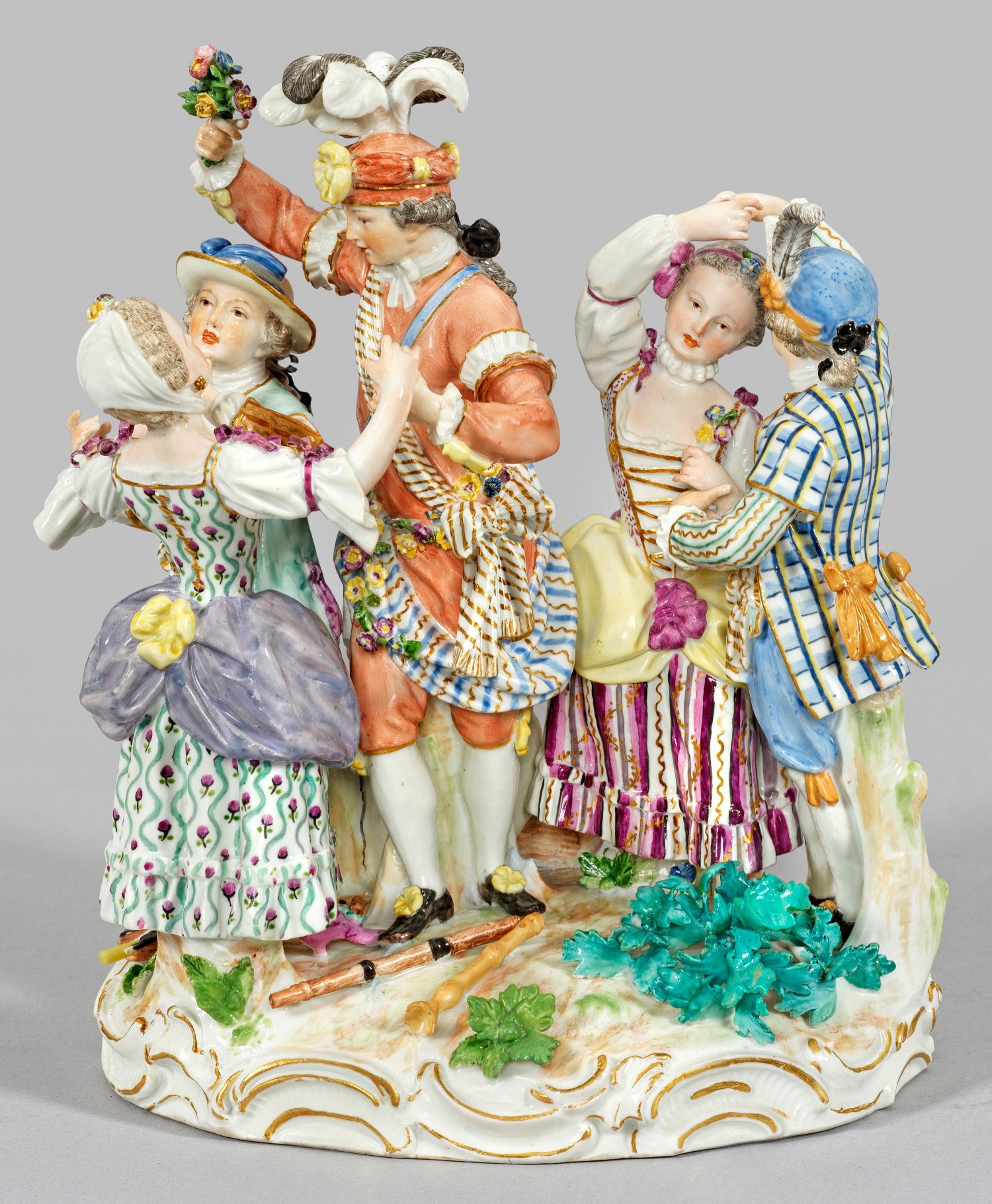 Ovaler, mit Blättern und verschiedenen Musikinstrumenten belegter Natursockel mit vielfiguriger szenischer Darstellung eines Tanzunterrichts. Der Tanzlehrer mit federgeschmücktem Hut, Blumenstrauß und Blüten geschmücktem Gewand, den beiden nebenstehenden, bewegt tanzenden Paaren in festlicher Kleidung Tanzunterricht gebend und dabei eine Dame an der Hand führend. Polychrome Malerei mit Goldstaffage. Entw. Michel Victor Acier, um 1768 - 1770. Unw. rest.; H. 23 cm.