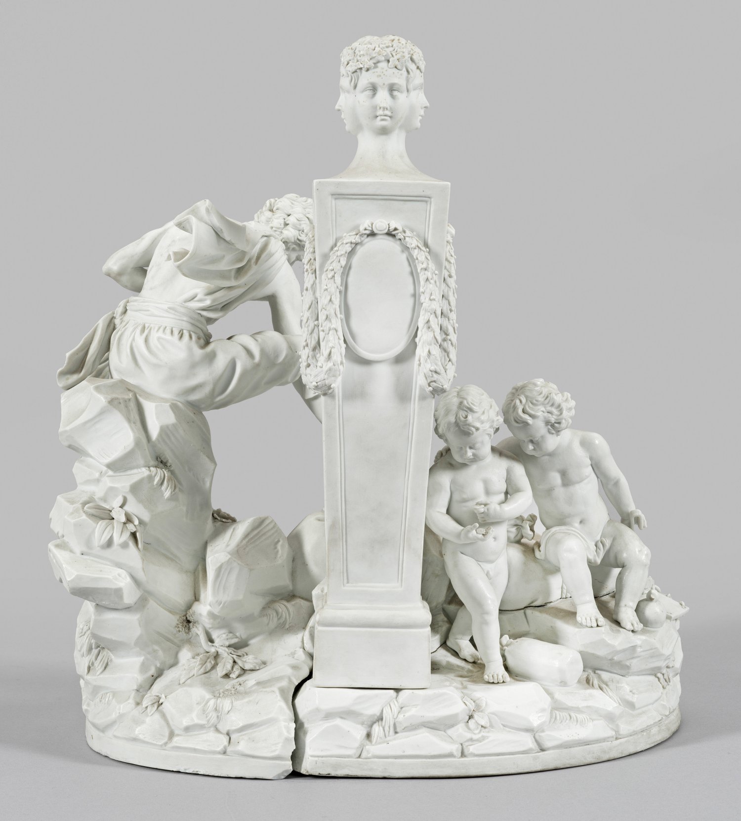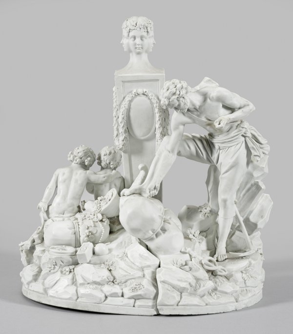 3-tlg.; Biskuitporzellan. Auf einem unregelmäßig gehöhten Gesteinssockel stehender, kräftiger junger Mann mit Anker, einen Ballen schnürend. Rückseitig zwei Amoretten beim Zählen der Münzen bzw. auf einem Warenballen sitzend, auf dem ein Füllhorn mit Schmuck und Münzen liegt. Den mit Efeufestons umkränzten Säulenschaft krönt das vierseitige Gesicht des Gottes Terminus. Entw. Michel Victor Acier, 1779. Modell-Nr. C 18. Terminus-Säulenschaft (19. Jh.) passend erg.; Teilw. besch./best.; Unw. rest.; Blaue Schwertermarke und teilw. eingepresste Schwertermarke im Dreieck. H. 42,5 cm. B. 41 cm. T. 29 cm.