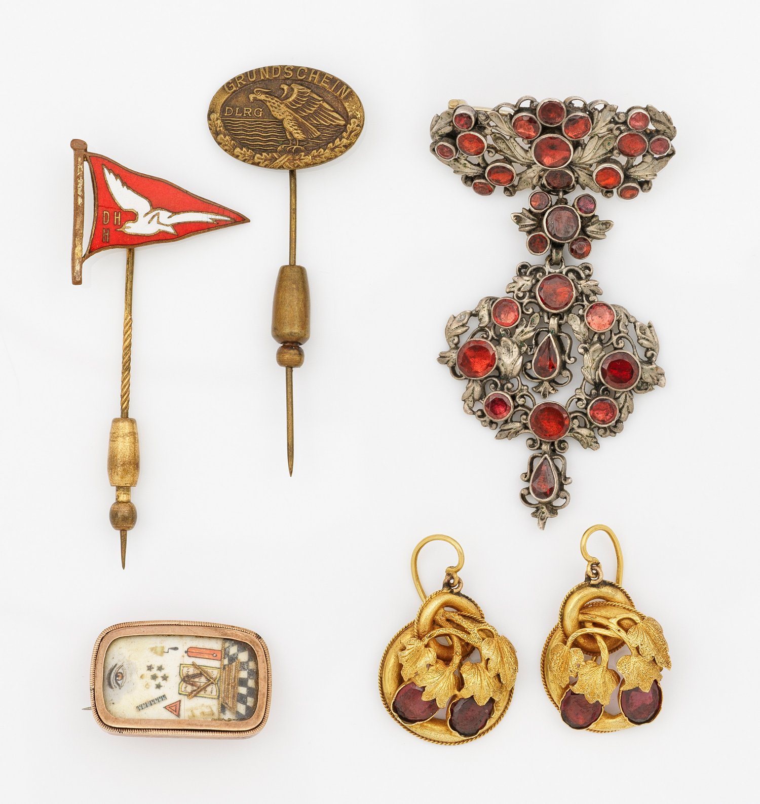 Spätbiedermeier- bzw. Belle Epoque-Zeit. Zwei Broschen, ein paar Ohrringe und zwei Anstecknadeln. Gelbgold, 14 k. Messing, vergoldet u. Silber, gest. 830. Teilweise emailliert, teilw. besetzt mit Granaten und Farbsteinen.