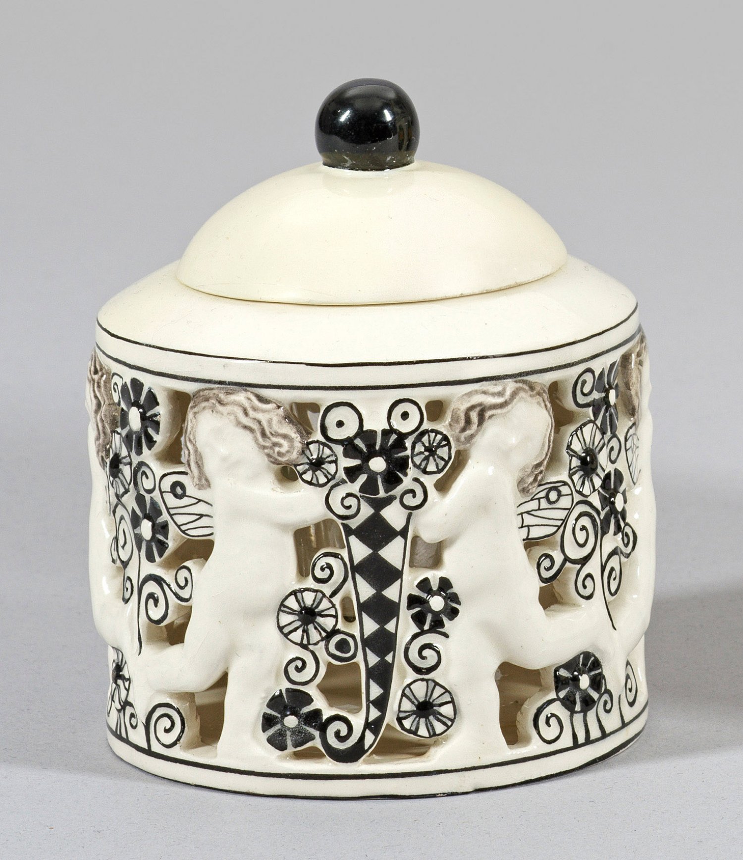 Steingut. Zylindrische Form mit durchbrochen gearbeiteter Wandung, der Reliefdekor aus laufenden Putti mit Füllhörnern und Blumenranken gegossen und ausgeschnitten. Gewölbter Deckel mit Kugelknauf. Schwarz bemalt. Rest.; Modell-Nr. 158 (eingepresst sowie "/3" in Schwarz gemalt). Entw. Michael Powolny, um 1907. Firmen-Pressmarke der "Wiener" Keramik sowie eingepresstes ligiertes Entwerfer-Monogramm "MP", Malermarke "PA" (in Schwarz, ligiert). Farbloser Glaseinsatz, wohl original. H. 10 cm.