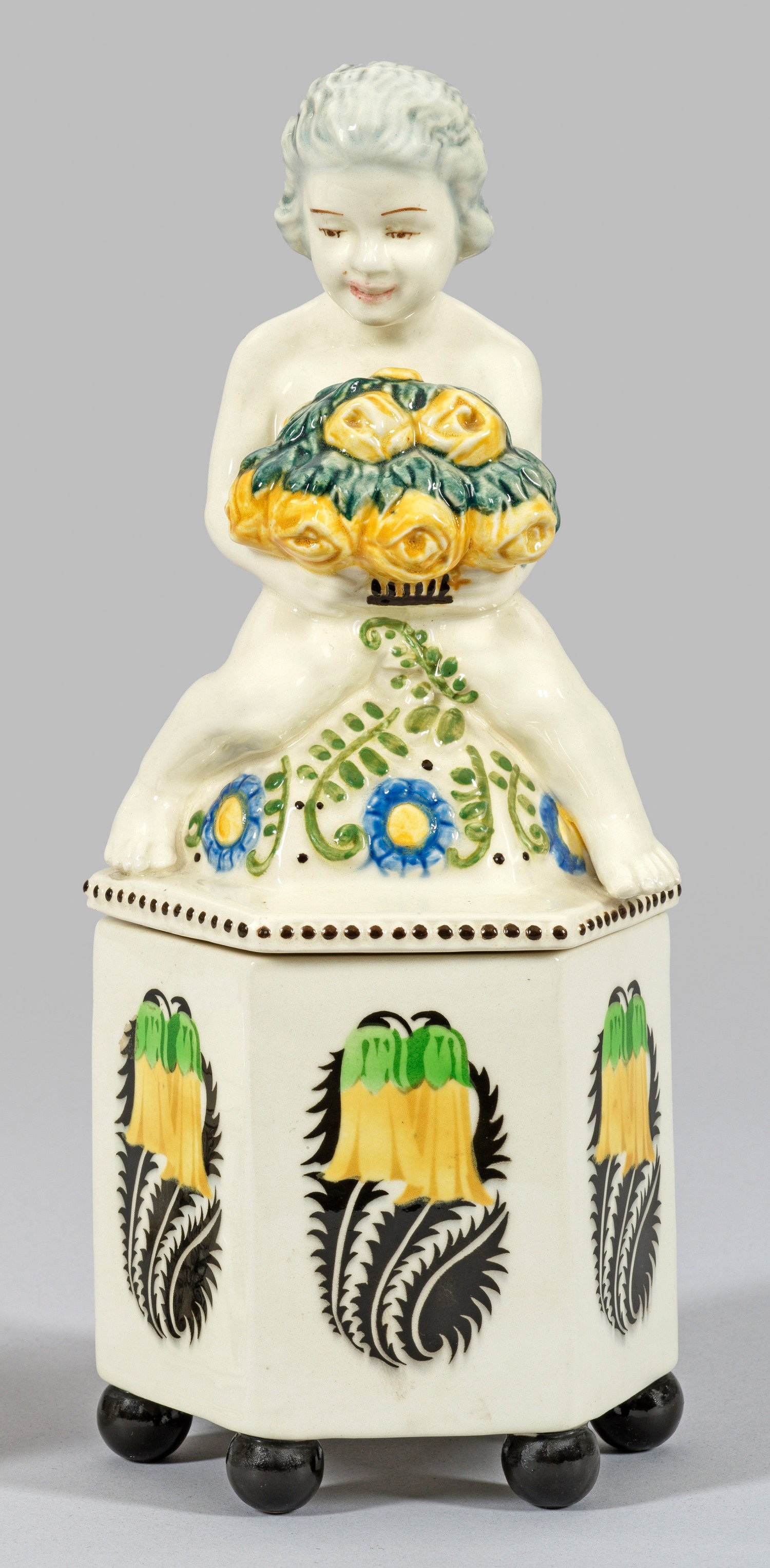 Steingut. Sechseckig, Kugelfüße, reliefierter bzw. plastischer, glockenförmiger Deckel. Polychrome Unterglasurbemalung, auf dem Unterteil ein wiederkehrendes florales Motiv. Modell-Nr. 8426, Dekor-Nr. 1194. Deckelrand und -falz minim. best.; Entw. Carl Klimt, um 1915. H. 30,5 cm.