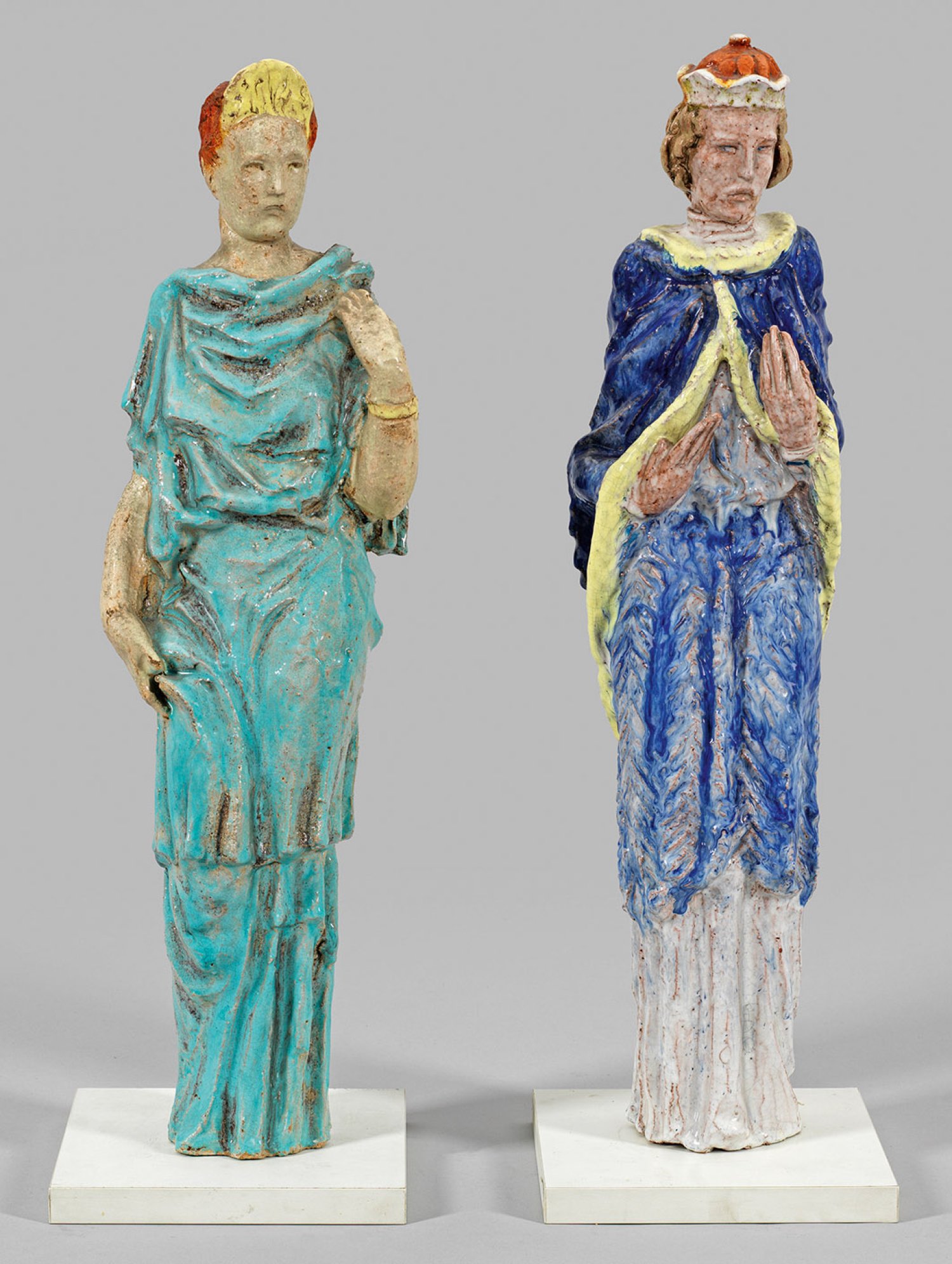 Keramik, sandfarbener bis rötlicher, leicht schamottierter Scherben, frei modelliert, innen gehöhlt; weiße Zinnglasur und polychrome Glasur bzw. Inglasurbemalung. Vollplastische Statuetten, die Römerin mit goldenem Kopfschmuck und Armreif in einem bodenlangen, helltürkisblauen Kleid, der König in stilisierter mittelalterlicher Tracht. H. 57 cm.