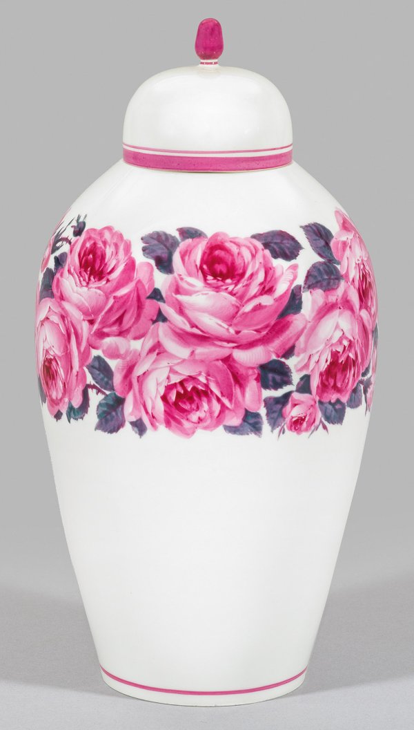 Eiförmig sich erweiternder Korpus mit eingezogener Schulter und passig aufgewölbtem Deckel mit Pinienknauf. Umlaufend der Wandung ein dichtes Band blühender und knospender Rosen. Weiche, polychrome, impressionistisch anmutende Malerei in der Art von Prof. Julius Eduard Braunsdorf. Purpurfarbene Staffage. Form-Entw. Oswald Jacob, um 1909 - 1911. Modell-Nr. A 251. Deckel minim. rest.; Schwertermarke. H. 32 cm.