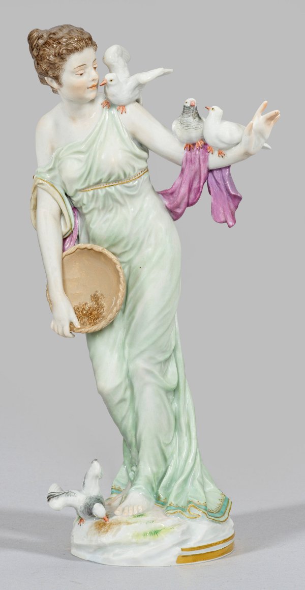 Auf ovalem Gesteinssockel stehende junge Dame in langem, hauchzartem Kleid, auf ihrem ausgestreckten Arm drei Tauben haltend, mit der anderen Hand eine ihr entgleitende Korbschale mit Körnern tragend. Auf dem Sockel sitzende Taube, die auf den Boden fallende Nahrung aufpickend. Feine polychrome Malerei mit Goldstaffage. Entw. Paul Helmig, um 1901 - 1904. Modell-Nr. T 63. Minim. rest.; Schwertermarke. H. 23 cm.