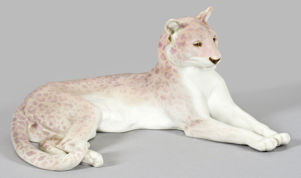 An Art Nouveau porcelain figure of a lying leopard. Manufacturer's mark.