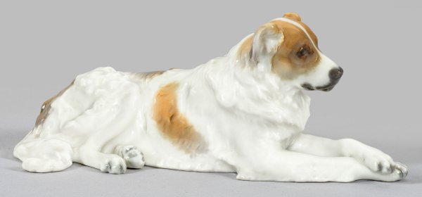 in wachsam liegender Haltung. Naturalistische Unterglasurmalerei. Jahreszeichen. Zepter und Malereimarke. L. 23 cm.