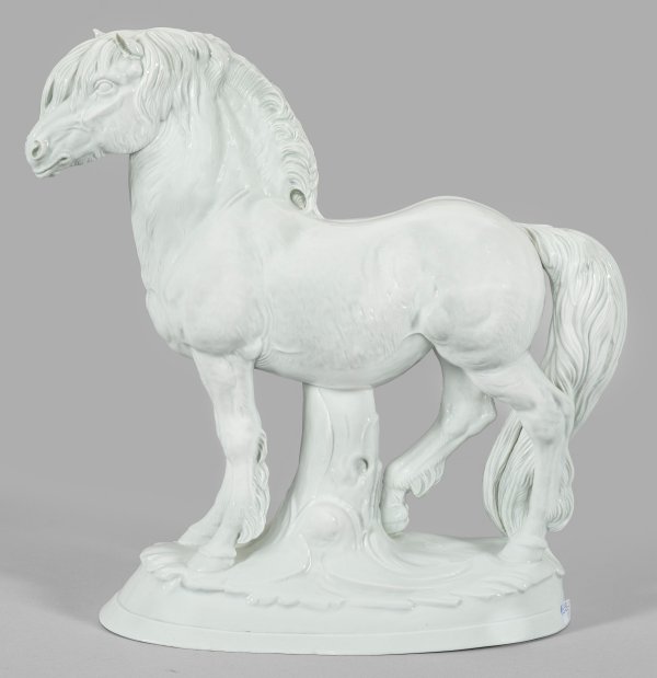 Weißporzellan. Auf aufgewölbter, profilierter Plinthe die naturalistische Darstellung eines stehendes Island-Pferdes mit fein reliefierter Mähne und Fellzeichnung. Entw. Willi Münch-Khe, 1927. Bez. und Dat. "Willi Münch-K (19) 27." Modell-Nr. A 1197. Minim. best./rest.; Schwertermarke. H. 36 cm. L. 35 cm.