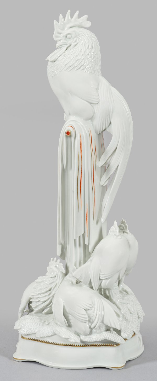 Auf einem passig geschweiften, goldkonturierten Podestsockel eine umlaufende Gruppe dicht beieinander sitzender Hühner mit Hahn auf blattreliefiertem Grund. Zentral auf einem hohen, kannelierten Säulenstumpf mit linienförmig in Gold und Korallenrot staffierter Decke, majestätisch sitzender Hahn mit langem, prächtigem Gefieder. Entw. Max Esser, 1925. Modell-Nr. 77442. Jahreszeichen. Schwertermarke. H. 43,5 cm.