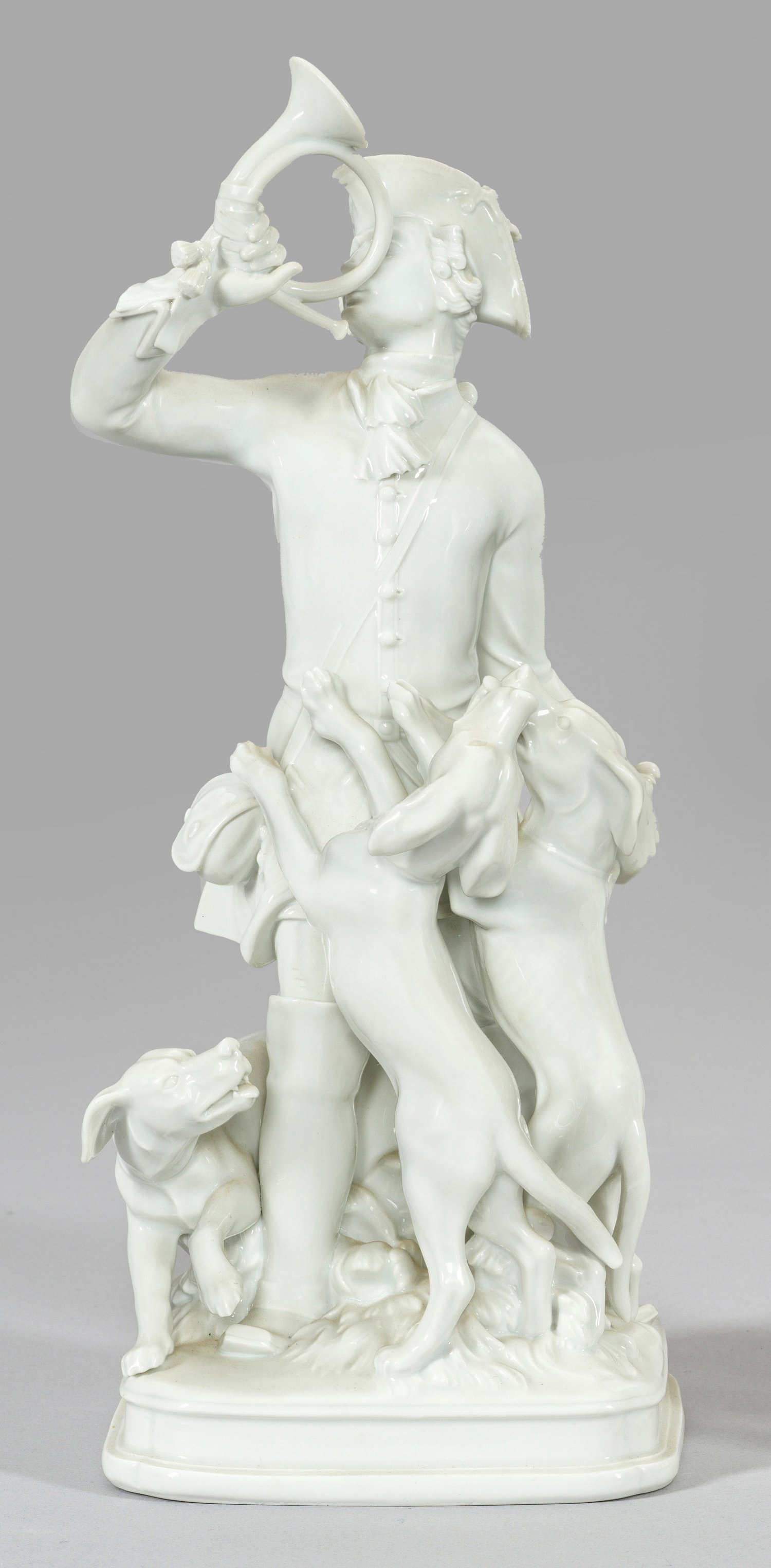 Weißporzellan. Auf einem rechteckig abgerundeten, profilierten Sockel stehender Jäger mit Dreispitz, sein Jagdhorn erhebend, mit drei ihn umkreisenden Jagdhunden. Entw. Alexander Struck, 1941. Entw.-Bez.; Modell-Nr. 63075. Schwerter- und Weißwarenmarke. H. 33 cm.