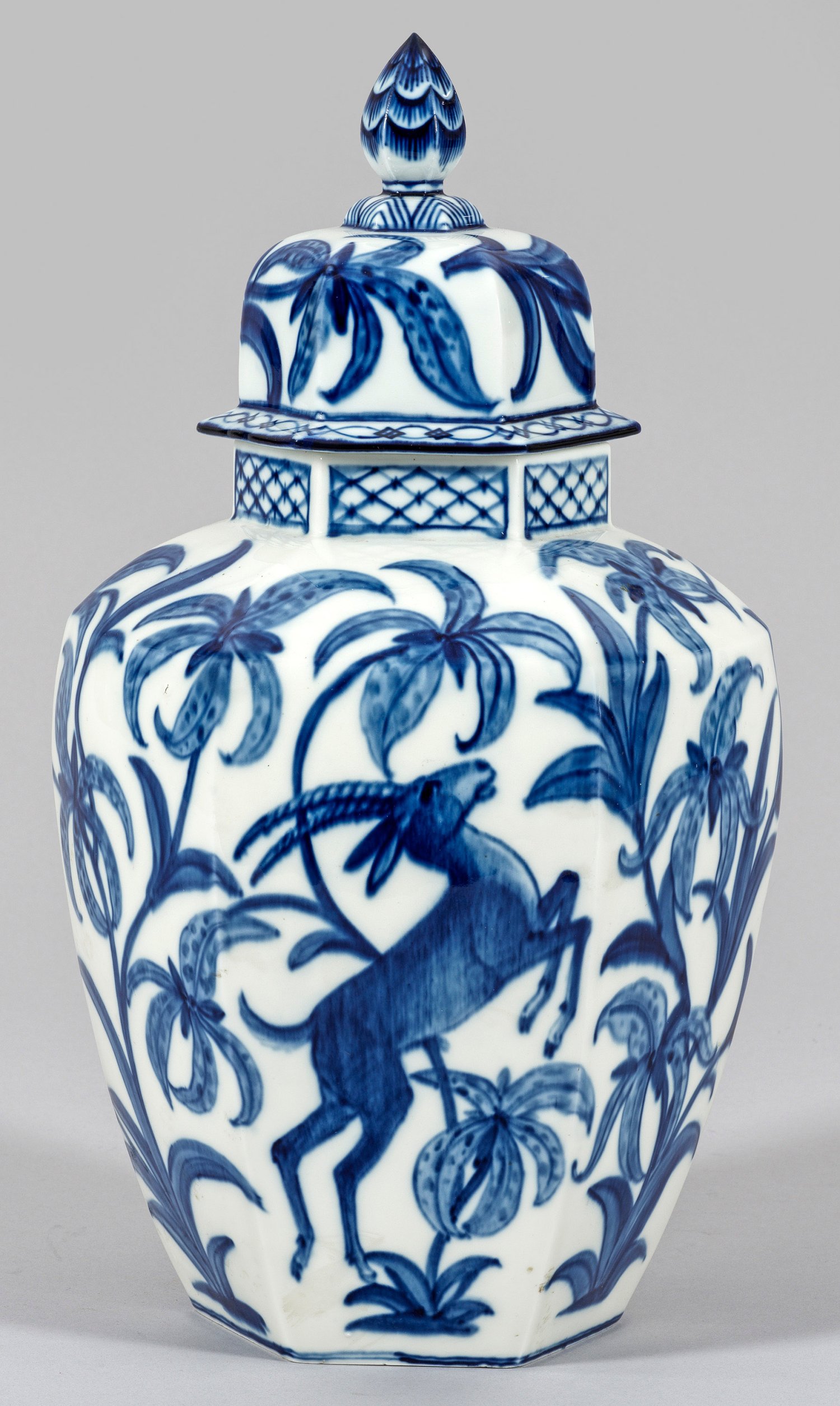 Balusterförmiger, sechsfach facettierter Korpus mit konisch eingezogener Schulter und kurzem Hals. Korrespondierender, überkragender Haubendeckel mit spitzem Knauf. Umlaufend der Wandung, flächendeckender, dichter Dekor aus blühenden Pflanzen mit springendem Steinbock und laufendem Reh. Gittermuster am Hals. Fein nuancierte Malerei in Unterglasurblau. Dekor-Entw. Hugo Stein. Maler-Monogr. "H. Stein". Modell-Nr. Q 165. Schwertermarke. H. 44 cm.