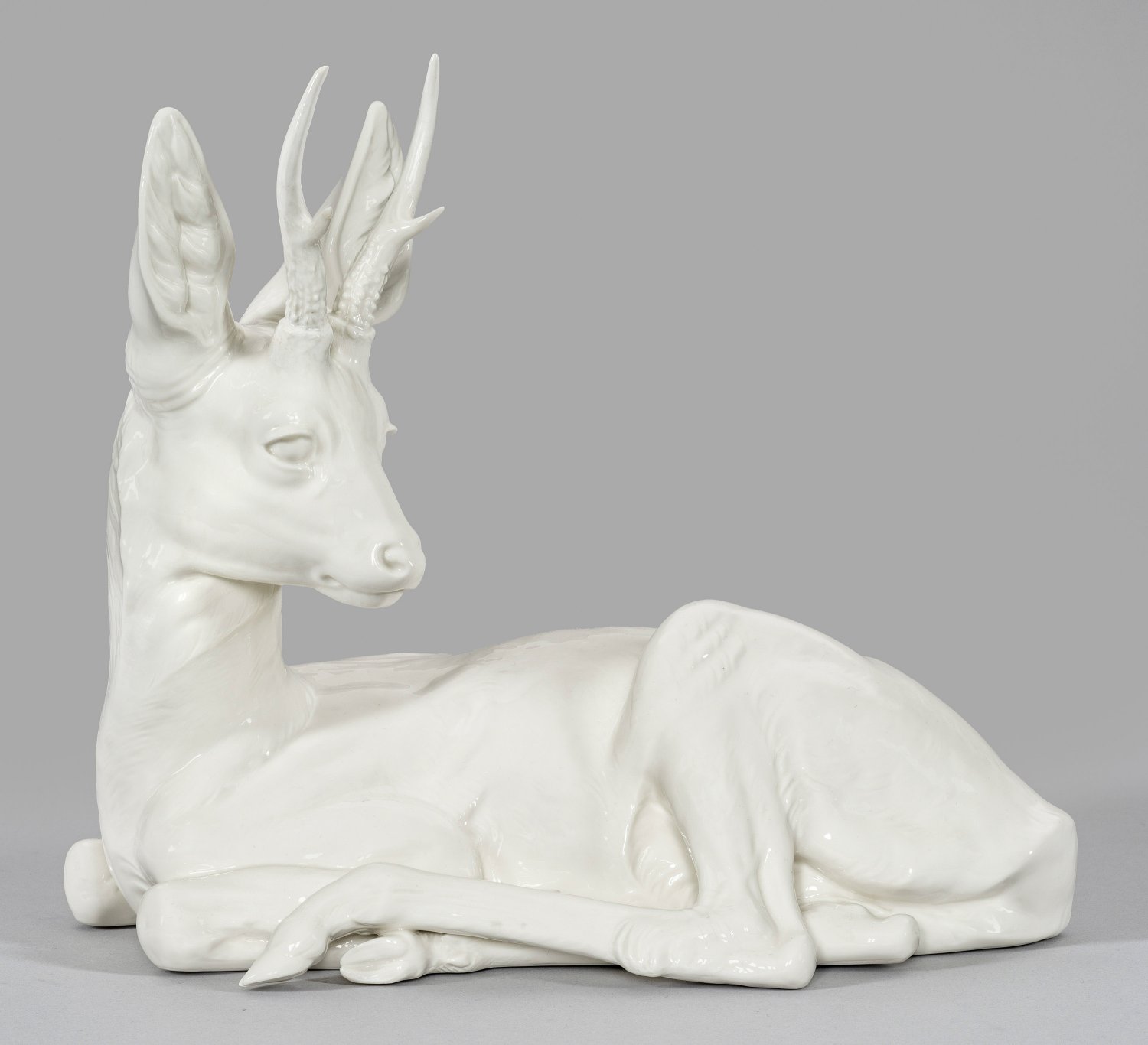 Weißporzellan. Naturalistische Darstellung eines ruhenden Rehbocks, den Kopf leicht zur Seite geneigt. Entw. Adolf Göhring, 1938. Entw.-Bez.; Modell-Nr. 842. Minim. rest.; Manufakturmarke. H. 28 cm. L. 31,5 cm.