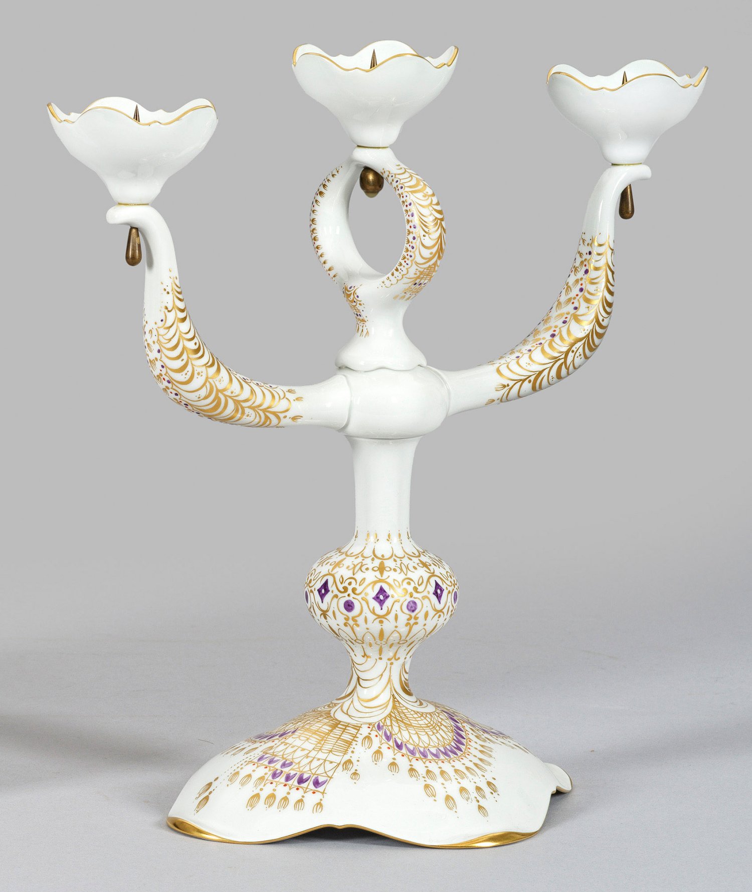 Messing, verschraubt. 3-flg.; Form "Neuer Ausschnitt". Über aufgewölbtem Vierpassfuß, gerader Schaft mit Nodus und ansetzendem, geschweiftem Arm mit zentralem, ösenförmigen Aufsatz. Darüber blütenkelchförmige Tüllen mit spitzem Messingdorn. Allseits Vorhang-Draperie nach Vorbild der Erzählungen "1001 Nacht" in feiner polychromer Malerei mit reicher Goldstaffage. Form-Entw. Ludwig Zepner. Dekor-Entw. Prof. Heinz Werner. Modell-Nr. 79254. Schwertermarke. H. 32 cm. B. 32 cm.