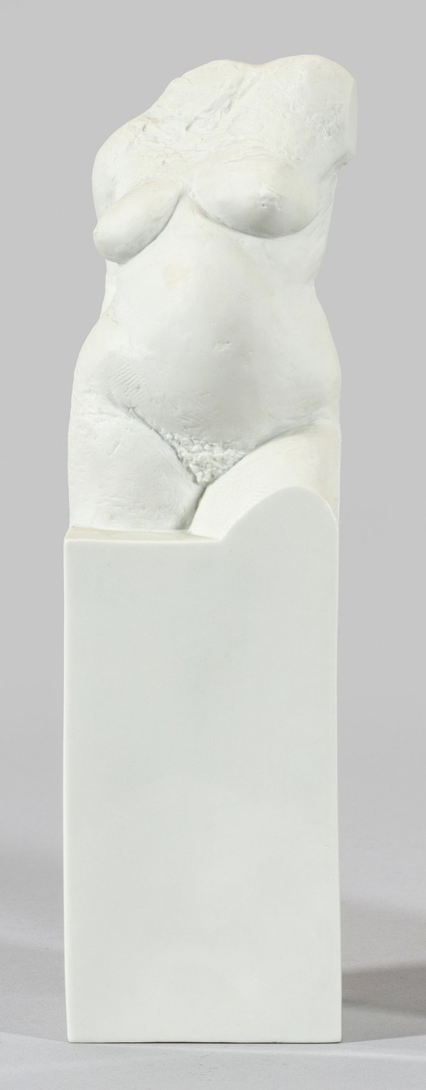 Biskuitporzellan, teilw. Weißporzellan, glasiert. Weiblicher Torso auf hochrechteckigem Postament. Entw. Christel Baumgärtel, 1986. Künstler-Sign. "Ch. Baumgärtel". Limitierung 8/50. Minim. ber.; Manufakturmarke. H. 30,5 cm.