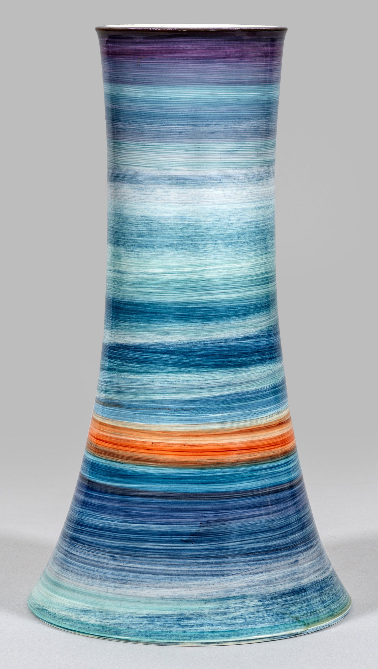 Kombinierbar. Trichterförmiger, zylindrisch sich verjüngender Korpus. Umlaufend der Wandung flächendeckender Dekor konzentrisch angeordneter Streifen. Polychrome Malerei. Form- und Dekor-Entw. sowie Ausführung der Malerei Volkmar Bretschneider. Künstler-Sign. mit Dat. "V. Bretschneider (19) 97". Dreher-Monogr. "GW" für Gert Wronkowski. Geritzte Unikat-Nr. 249/1997. Bez. für Atelierporzellan. Zertifikat. Schwertermarke. H. 43 cm.
