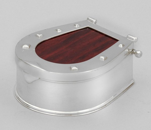 Sterlingsilber und Holz. Flacher Stand mit gering ausgestelltem Standring, übergehend in hufeisenförmigen Korpus mit glatter Wandung. Scharnierter Deckel mit Holz ausgekleidet und mit Nieten besetzt. Gest. 925, Beschauzeichen mit Herstellernummer "825". Gew. ca. 560 g. H. 5,5 cm. 13,5 cm x 11 cm.