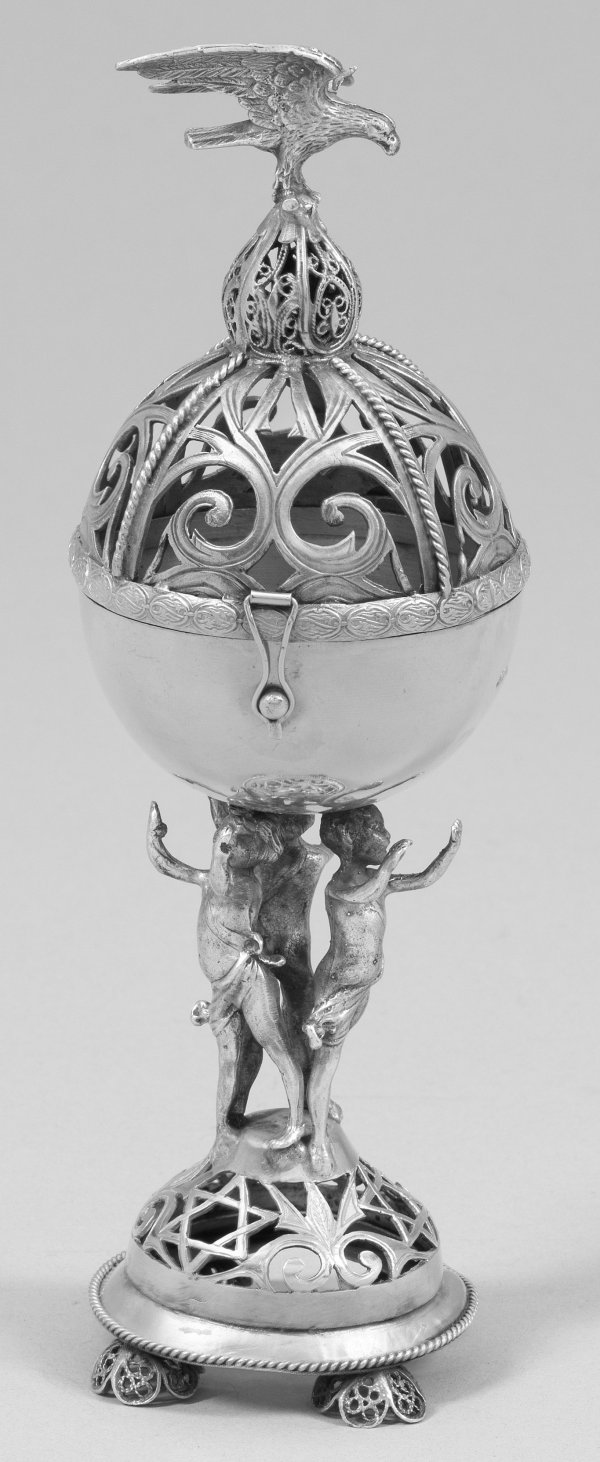 Silber. Auf vier blütenförmigen Füßen runder Sockel, darauf drei vollplastische Knabenfiguren, mit deren Köpfen den mittig scharnierten, runden Korpus tragend. Auf dem knospenförmigen Knauf ein vollplastischer Vogel. Fuß, Korpus und Knauf größtenteils in Ajour gearbeitet und mit Blättern, Voluten und Davidssternen verziert. Ränder und Profillinien teilw. mit Ornamentbordüren. Teilw. undeutl. gest. 84, Beschaumarke "AK", dat.; Gew. ca. 225 g. H. 19,5 cm.