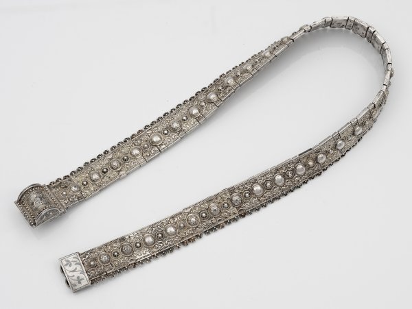 Silber, mit sog. Niellotechnik, Restvergoldung. Feingliedrig gearbeitet, bestehend aus 65 Gliedern, auf einem Lederband aufgezogen. Reliefplastischer Dekor aus Voluten und halbkugelförmigen Medaillons. Der Rand teilw. durchbrochen gearbeitet. Die Schnalle mit stilisiertem Blütendekor und Perlfries. Nahezu jedes Element gest. 84, unbekannte, kyrillische Meistermarke "3A". Gew. ca. 670 g. L. 86 cm. Schnallen-H. 3,7 cm.