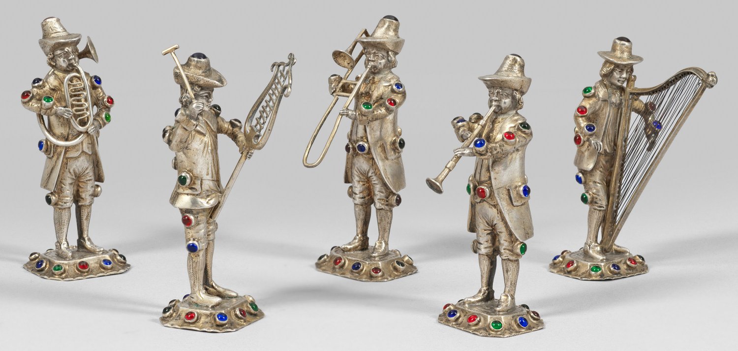 Silber, vergoldet. 5-tlg.; Über gering ansteigendem, rechteckigem Stand mit geschrägten Ecken die vollplastischen Darstellungen je eines musizierenden Mannes z. B. mit Harfe oder Klarinette in traditioneller Kleidung mit Hut. Stand und Korpus besetzt mit gefassten blauen, roten und grünen Glassteincabochons. Gest., englische Pseudomarken. Gew. zus. ca. 615 g. H. 12 cm - 12,5 cm.