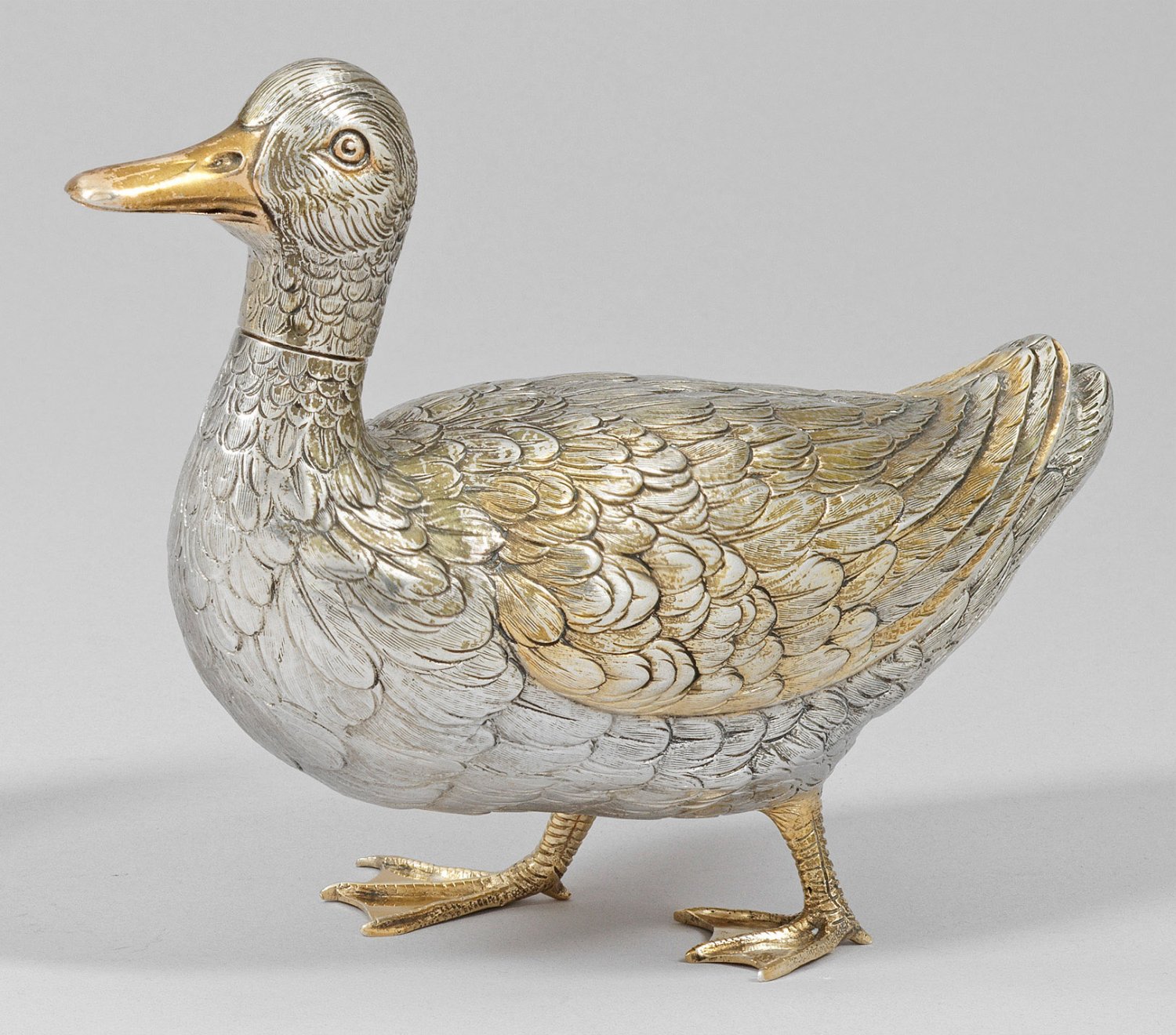 Silber, teilw. vergoldet. Naturalistische, vollplastische Ausarbeitung einer schreitenden Ente mit detailliert ausgeführter Gefiederzeichnung und abnehmbarem Kopf. Gest. "A835", undeutl. Herstellerzeichen, französische Repunzierung seit 1893. Gew. ca. 490 g. H. 16,5 cm