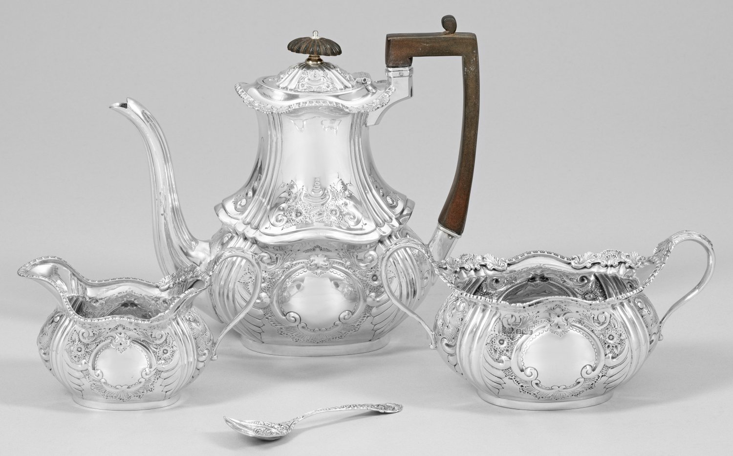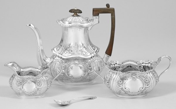 Sterlingsilber. 3-tlg.; Kaffeekanne, Zuckerschale und Sahnegießer. Schmaler, bauchiger Korpus mit hochgezogenem Hals. Wandung gegliedert von vertikalen Zügen und verziert mit reliefplastischem Voluten- und Blütendekor. Gekanteter Henkel und godronierter Knauf. Teilw. innen vergoldet. Dazu ein Löffel, gest. 835. Gest., Beschaumarken, Herstellerzeichen, Jahresbuchstabe "k". Gew. zus. ca. 1310 g. H. 10 cm x 22,5 cm.