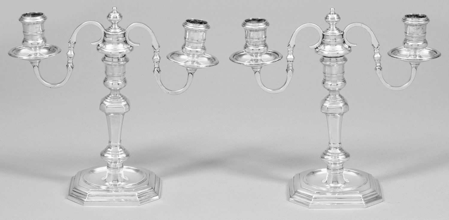 Sterlingsilber. 1 bzw. 2-flg.; Über getrepptem oktogonalen Sockel mehrfach genodeter Schaft mit zylindrischer Tülle, darin einsetzbar ein Aufsatz mit zentralem Balusterabschluss und zwei geschwungenen Armen mit Tüllen und Traufschalen. Gest., Beschaumarken, Herstellerzeichen, Jahresbuchstabe "O". Gew. zus. ca. 1740 g. H. 22 cm.