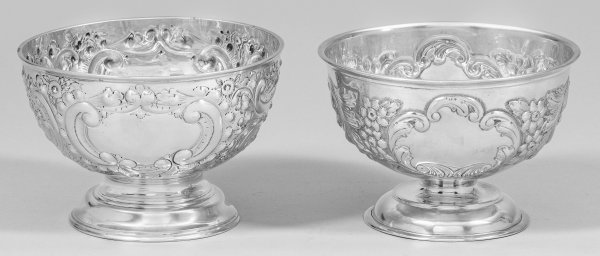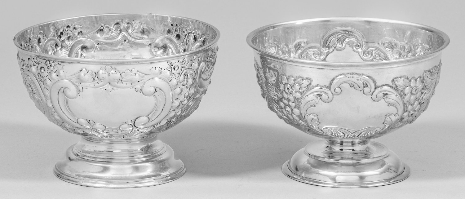 Sterlingsilber. Profilierter, aufgewölbter Stand, übergehend in weit ausschwingende Schale. Die Wandung umlaufend umzogen von reliefplastischen C-Schwüngen, Rocaillen, Akanthusblättern und Blüten. Gest., Beschaumarken, unterschiedliche Herstellerzeichen, Jahresbuchstabe "a" und "h". Gew. zus. ca. 780 g. H. 12 cm - 12,4 cm. D. 18 cm.