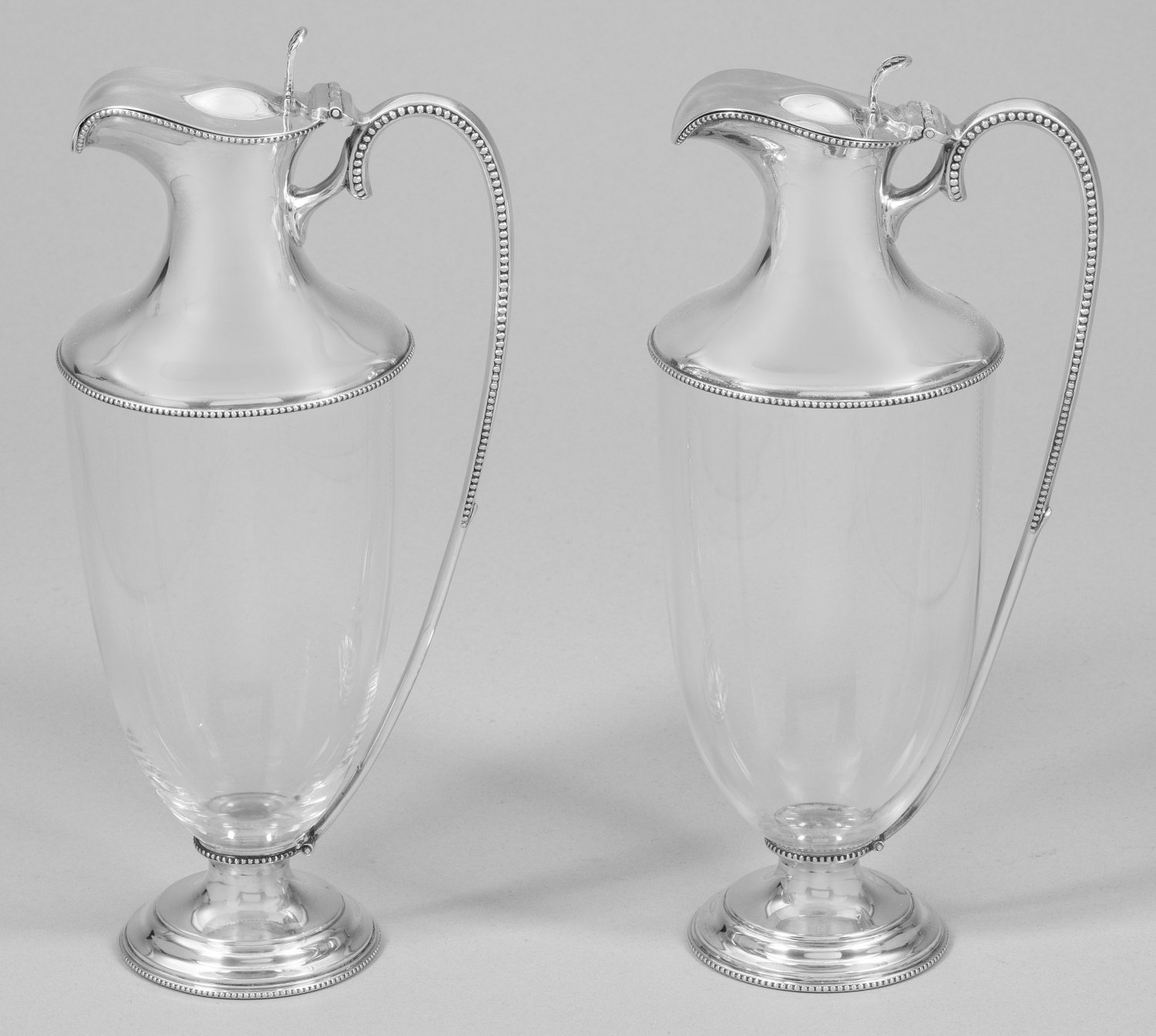 mit Sterlingsilbermontierung. Trompetenförmiger Stand, übergehend in schmalen, ohrenförmigen Henkel und konischen Glaskorpus. Abgesetzte, glatte Schulter und schlanker Hals in seitlichem Ausguss endend. Scharnierter Deckel mit blattförmig, durchbrochen gearbeitetem Drücker. Die Korpusränder umzogen mit zartem Perlband. Gest., Beschaumarken, Herstellerzeichen, Jahresbuchstabe "b". H. 28,5 cm.