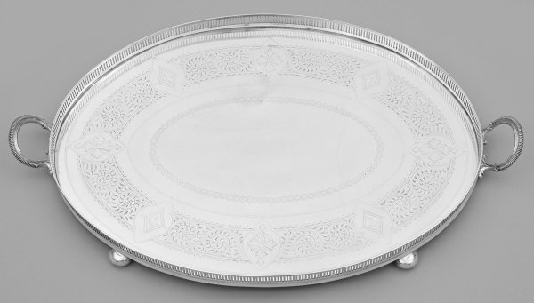 Sterlingsilber. Über vier gedrückten Kugelfüßen ovale Platte mit stabförmig durchbrochen gearbeitetem Galerierand. Glatter Spiegel verziert mit ziselierten Zierbändern aus Blütenkelch- und Blattdekor. Seitliche, godronierte Handhaben. Gest., Beschaumarken, undeutl. Herstellerzeichen, Jahresbuchstabe "c". Gew. ca. 3120 g. H. 5 cm. 67,8 cm x 41 cm.