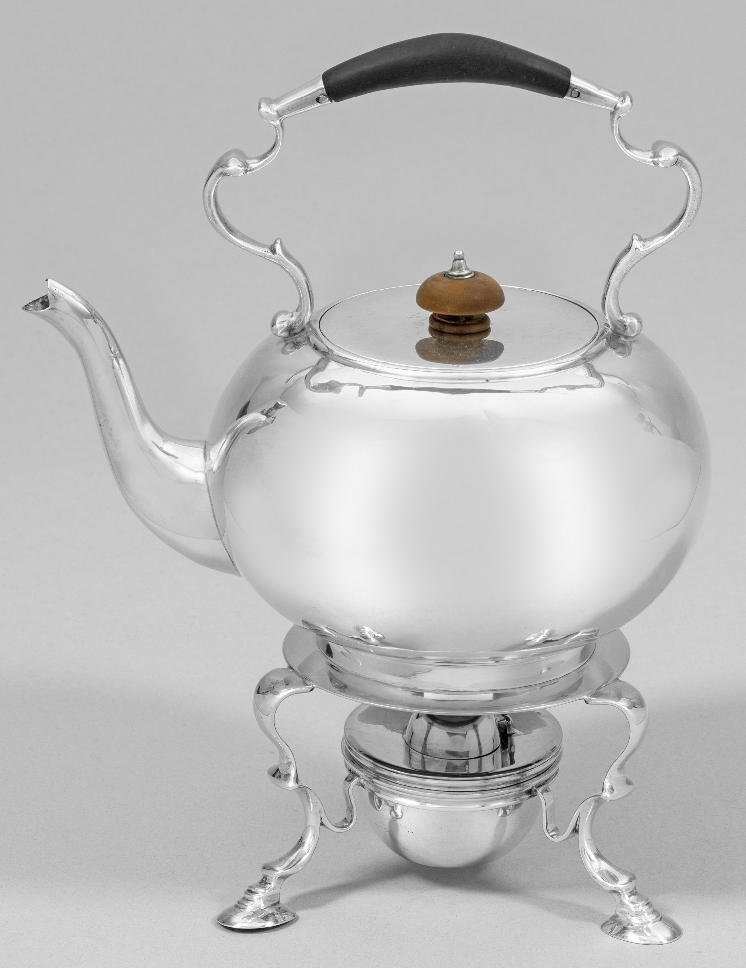 Sterlingsilber. Über drei ausgestellten, stilisierten Huffüßen durchbrochen gearbeitete Halterung mit Brenner. Gedrückt kugeliger Kannenkorpus mit konischem Röhrenausguss und übergreifendem, volutiertem Henkel teilw. aus ebonisiertem Holz. Knauf aus braunem Bakelit. Gest., Beschaumarken, Herstellerzeichen, Jahresbuchstabe "d". Gew. zus. ca. 700 g. Ges.-H. 25 cm.